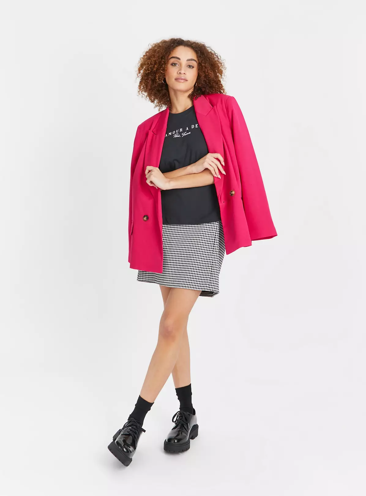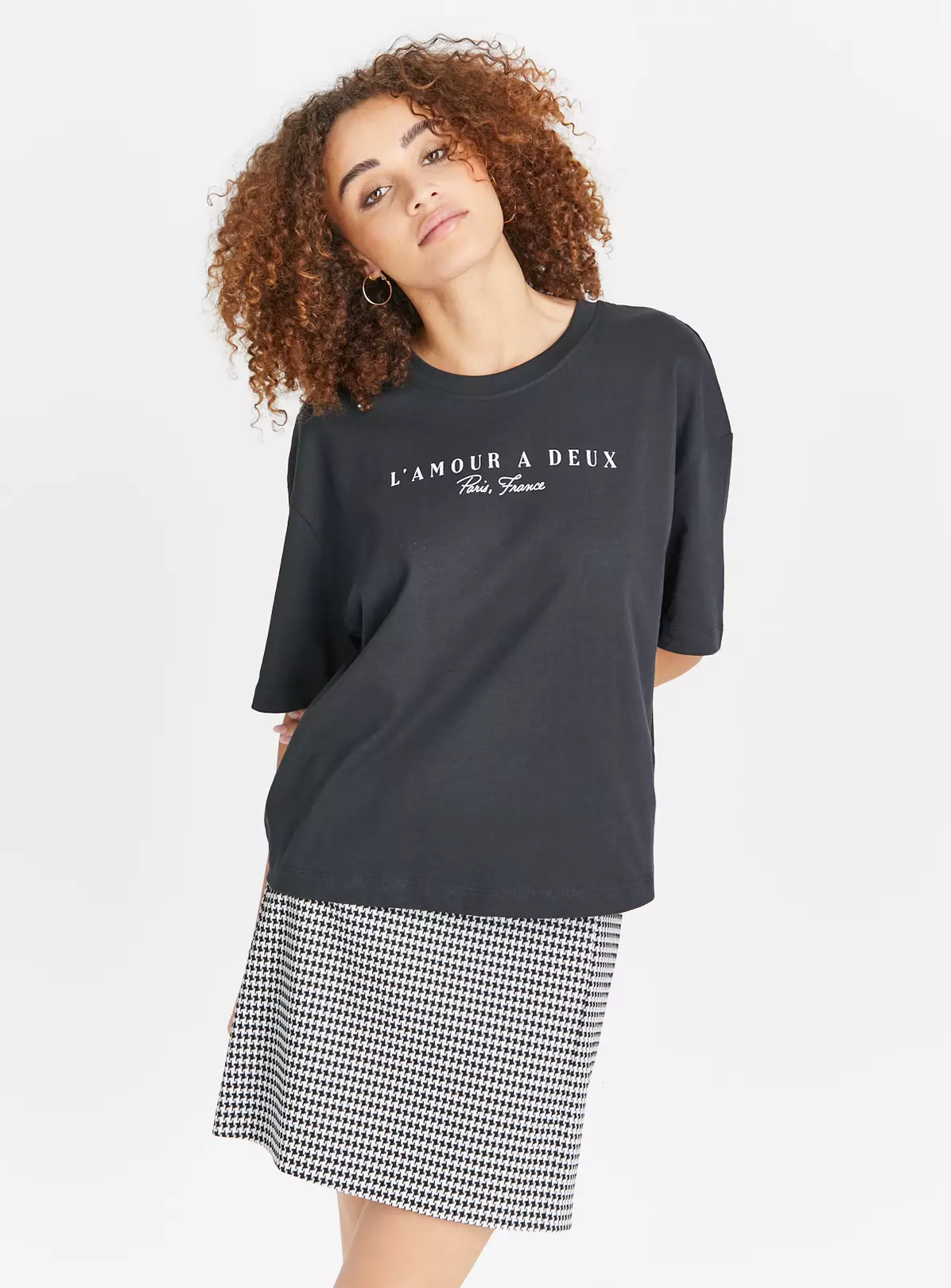 An effortlessly chic tee for your collection! Our black tee comes in a flattering boxy fit and features a ‘L’amour A Deux’ slogan on the front. Perfect for pairing with mono mini skirts this season.