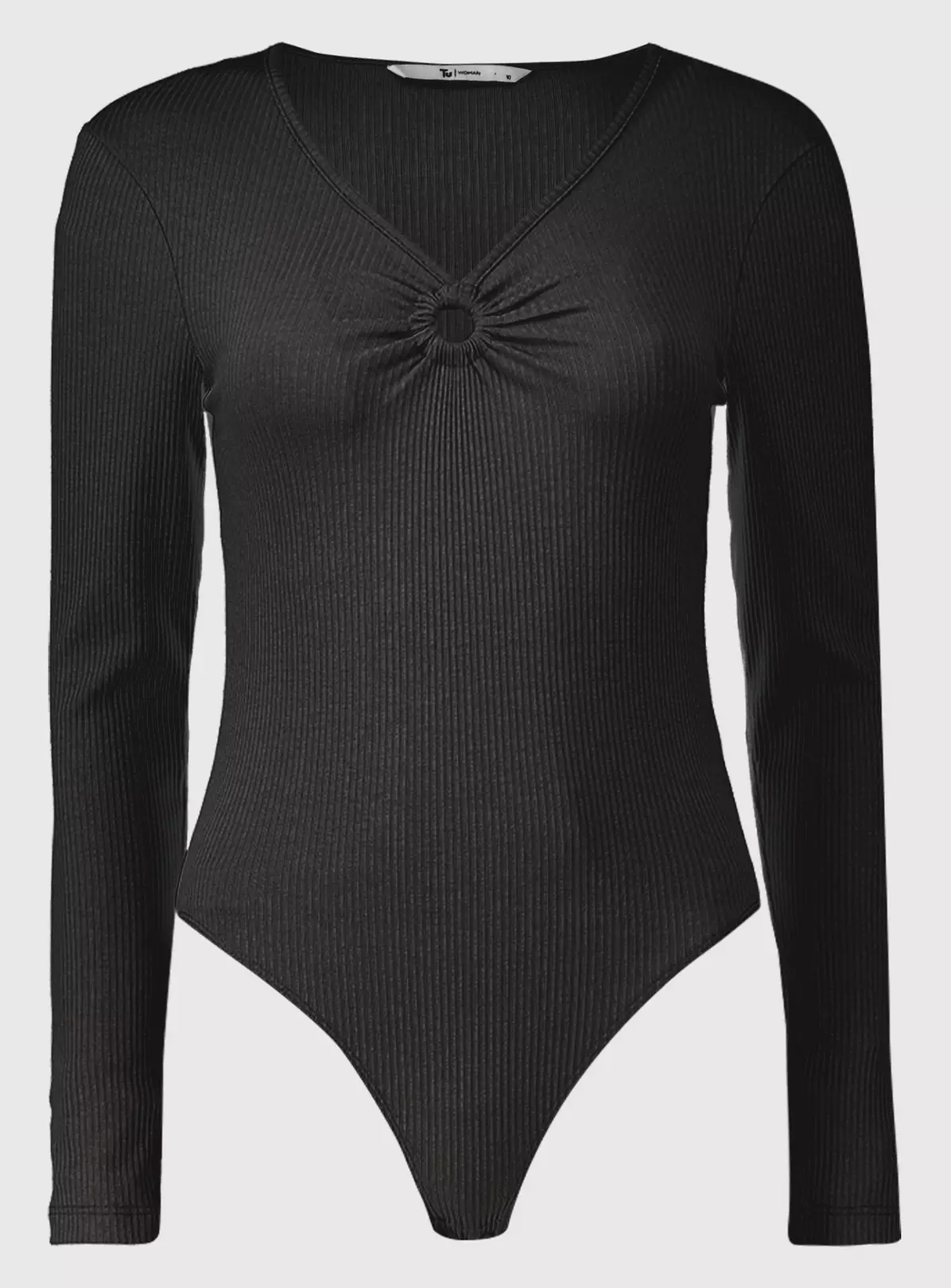 Perfect for layering, this super cute black ribbed bodysuit is crafted in a stretchy fabric and features a stylish ring detail with gathering and it has a poppered gusset. It looks great with jeans, skirts and more. Also available in a gorgeous mink shade.