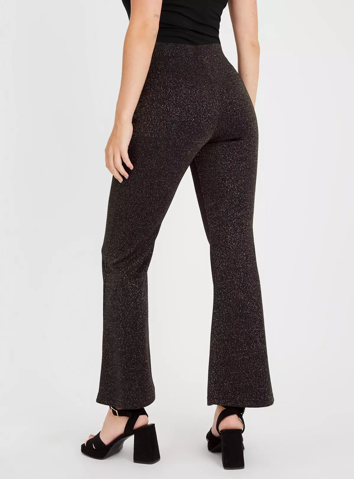 Glam up your eveningwear this season with our fabulous black sparkly trousers. In a trendy kick flare design, they have a super comfy pull-on waist. Team with the matching item (coming soon) and some strappy sandals.