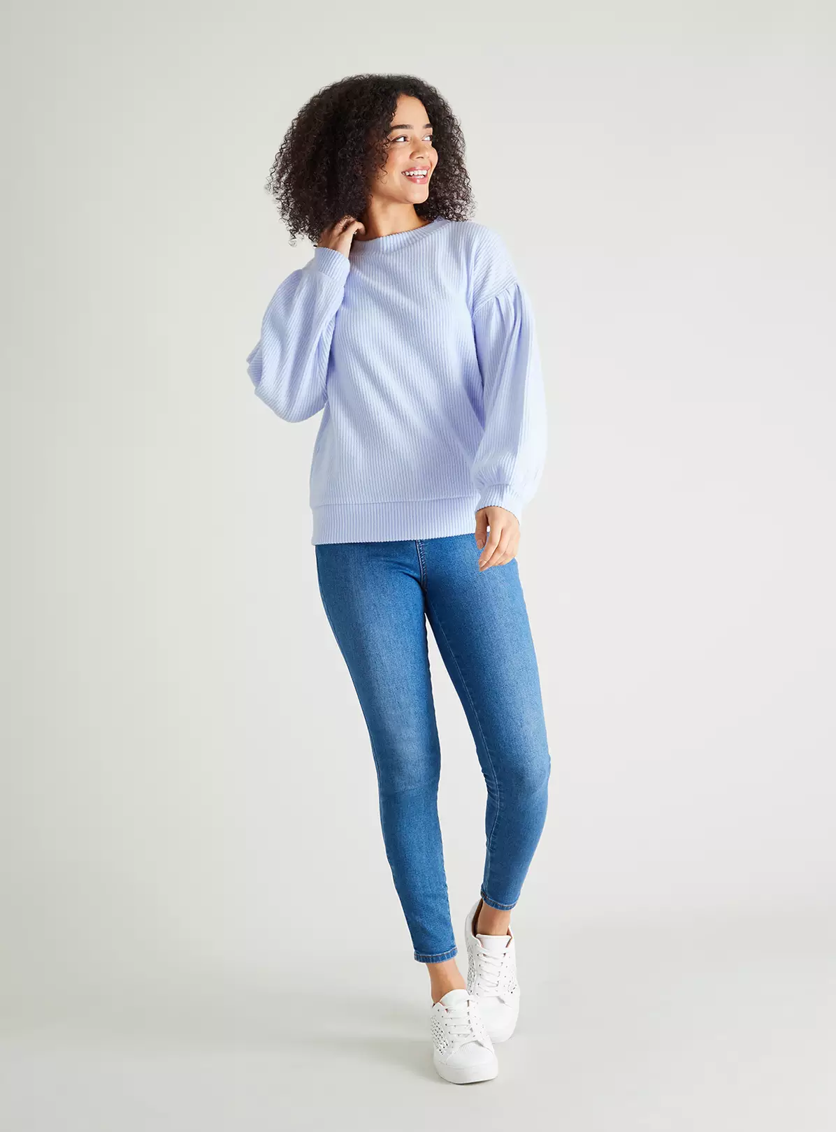 Beat the chill and look the part with this warm and cosy ribbed knitlook top. With gorgeous balloon sleeves and in a beautiful sky blue, it looks amazing with denim jeans and chelsea boots. Available in other colours.