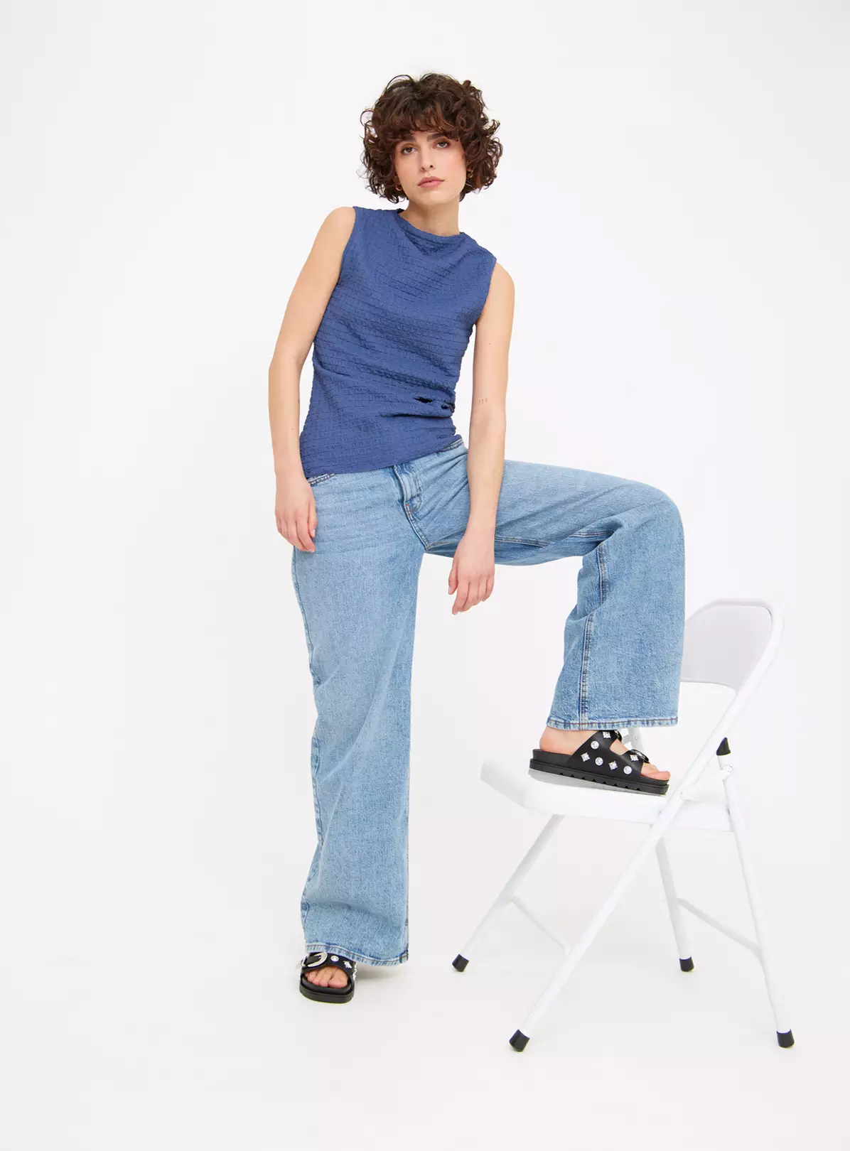 Beautifully designed in a crinkle material, our blue sleeveless top comes in a high neck for a modern touch. Elevate your look by pairing it with wide leg denim jeans and a pair of sandals.