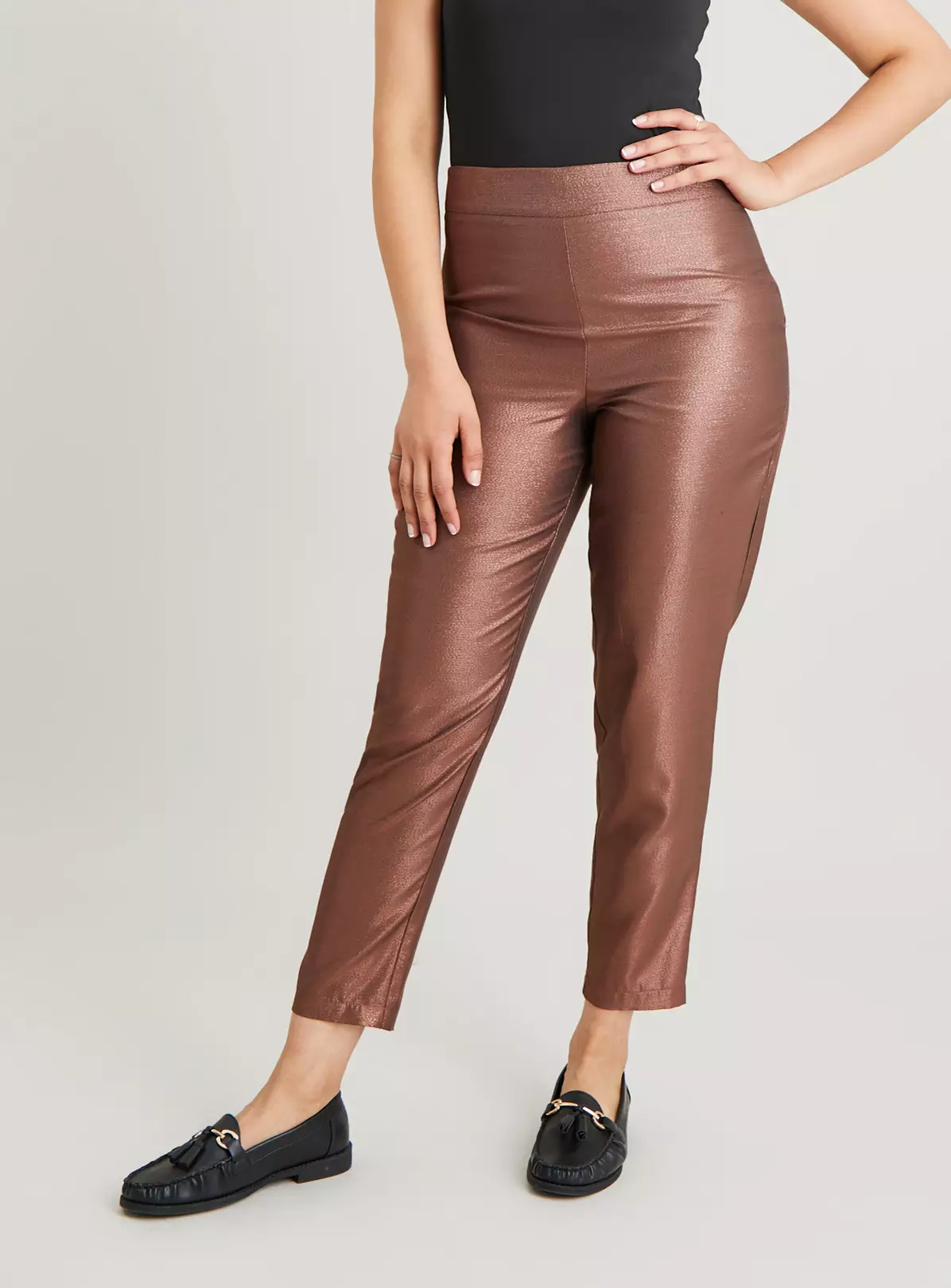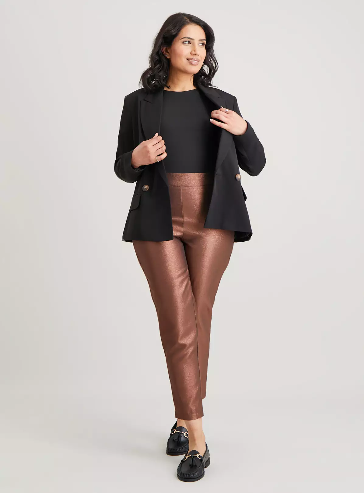 Add these sparkly trousers to your party pieces and prepare to collect the compliments! In an autumn-ready bronze with a tapered leg and wide waistband, they have comfort and élan in equal measure. Team with our black blazer and vest top, and add smoky eyes.
