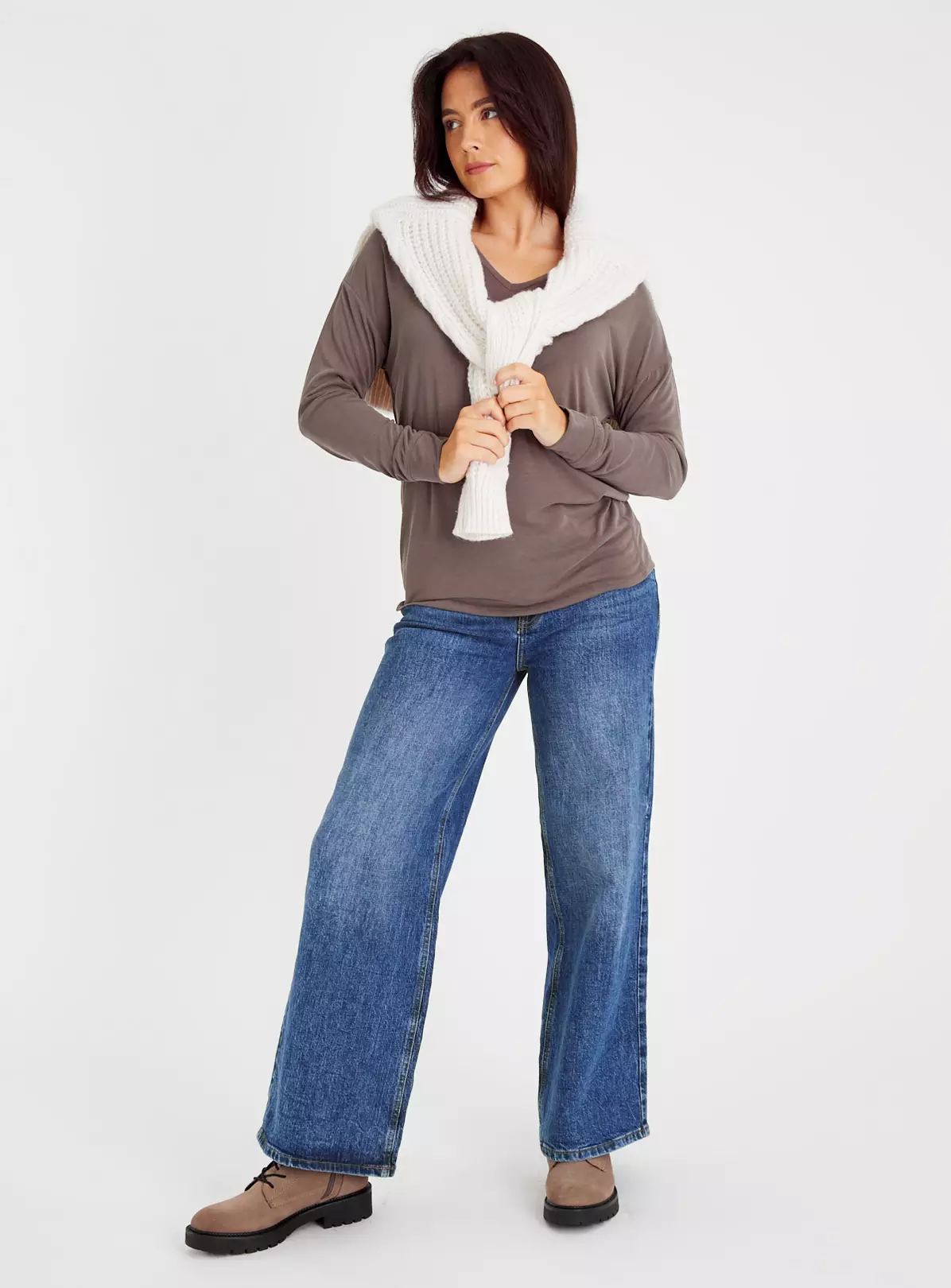 Build up on your basics with this brown relaxed fit top. Featuring a flattering v neckline, it comes in a lightweight comfy fabric. Perfect for layering, style it with blue denim jeans and a black gilet.