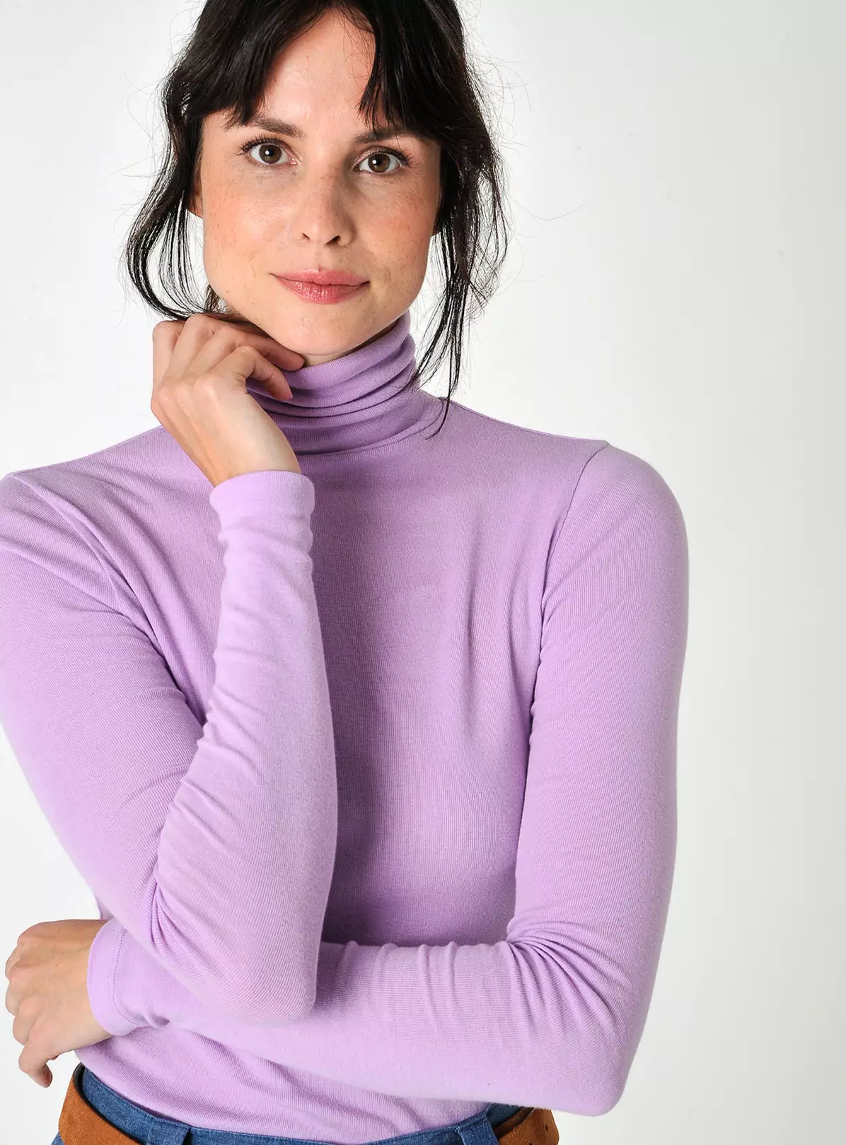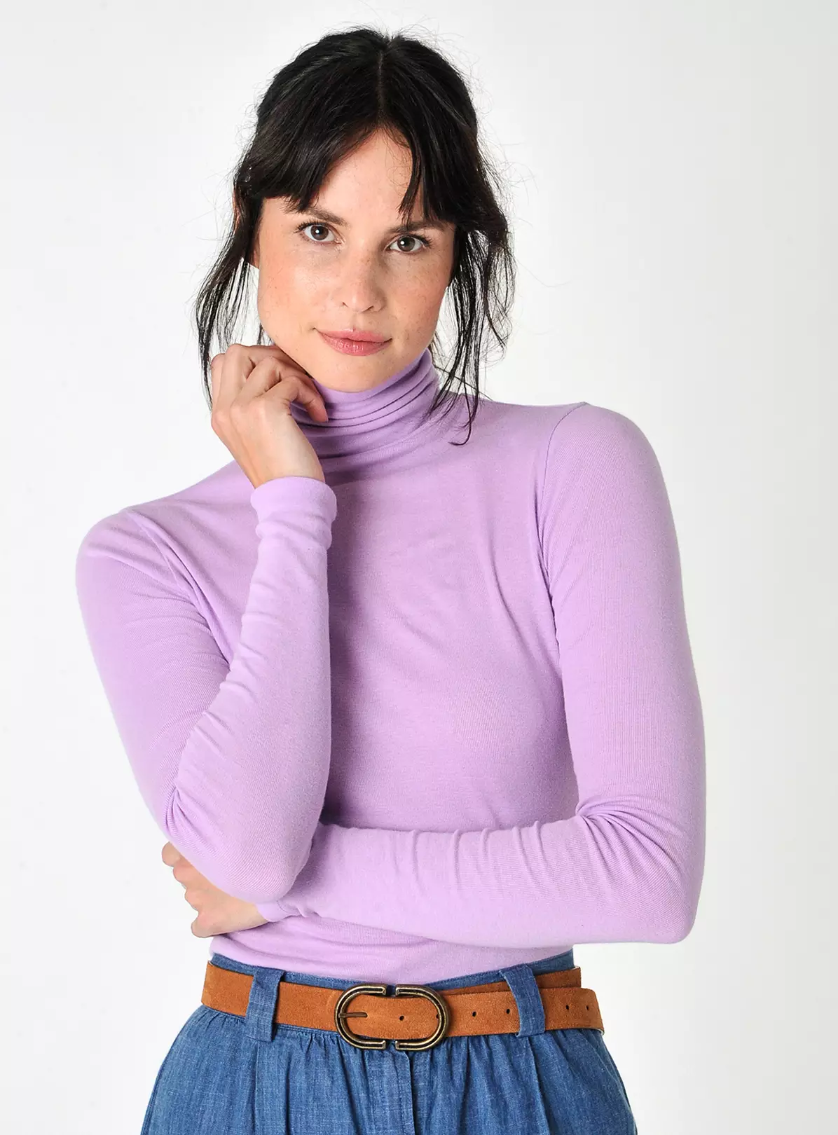 We are bringing Agnes back. Our long sleeve roll neck top that will soon become your favourite item this season.It is cut from soft cotton jersey, that features a mini ribbed texture and comes in a few shades. This one is a soft lavender.It hugs the body comfortably and stretches easily.Wear it with our chino trousers or under any printed dress to stay warm this winter!