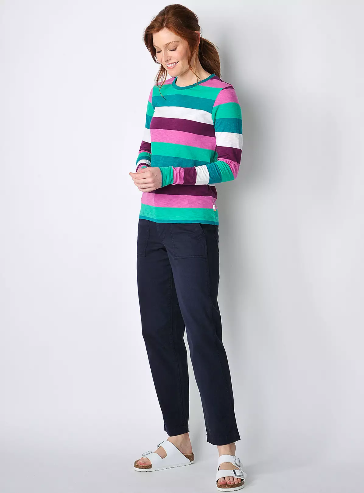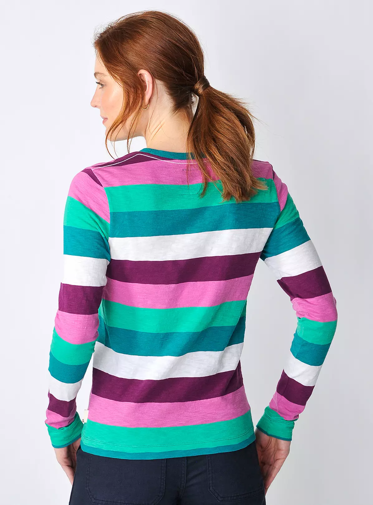 Portreath is our update on a classic long sleeve yarn dye stripe tee. Crafted in our 100% responsibly sourced single jersey, this style has been designed with a bold rainbow stripe in fresh green and pink hues. Combined with our laundered wash for a soft finish.