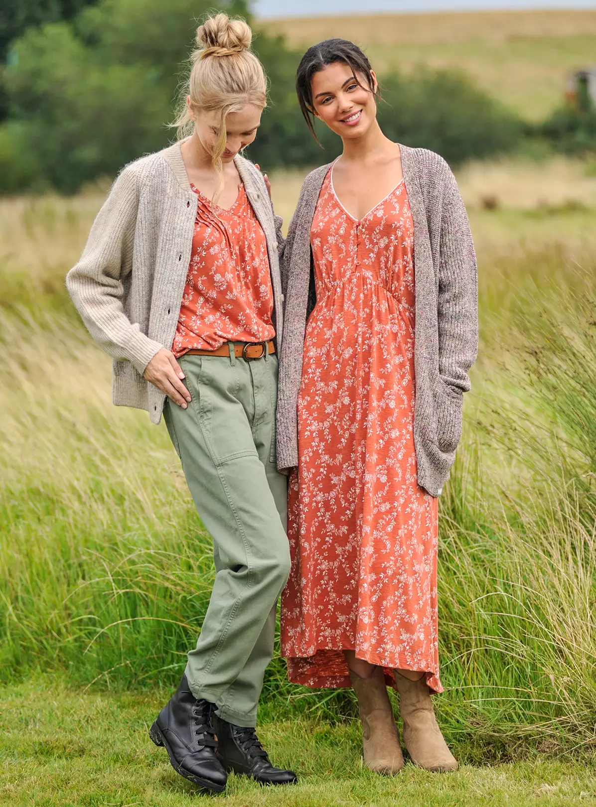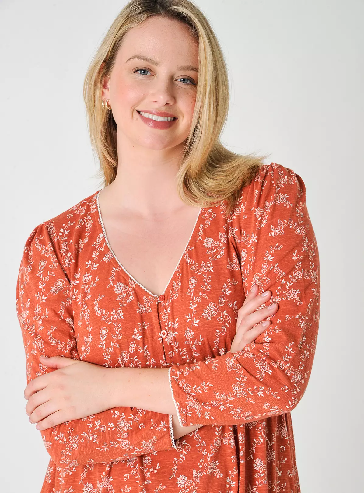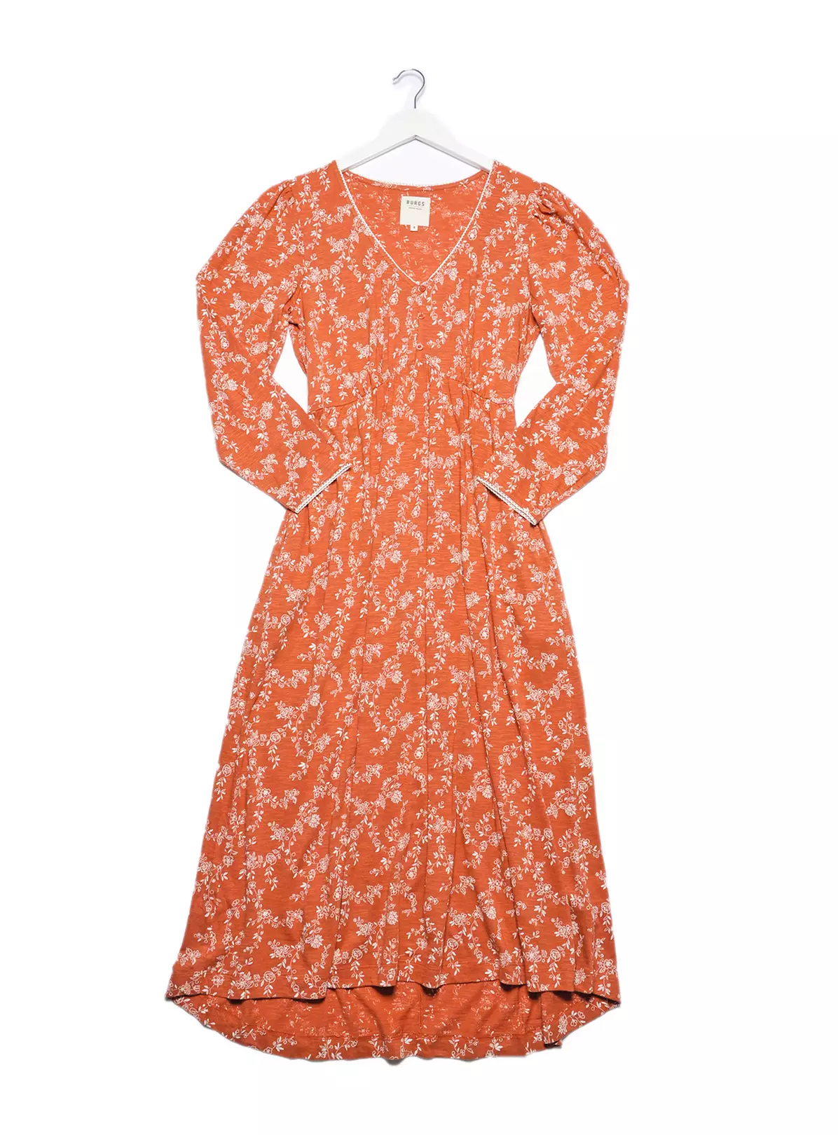 It doesn’t get any easier than a cozy, throw-on midi dress made from our soft, responsibly sourced cotton- blend jersey.With V-neckline framed by a scallop edge delicate trim, it has an empire waist and values running down the front. Drapes soflty towards the hem. Covered in a soft ditsy print in bright burnt orange, unique to Burgs.This dress runs larger than usual sizing, get a size down for a body hugging fit.