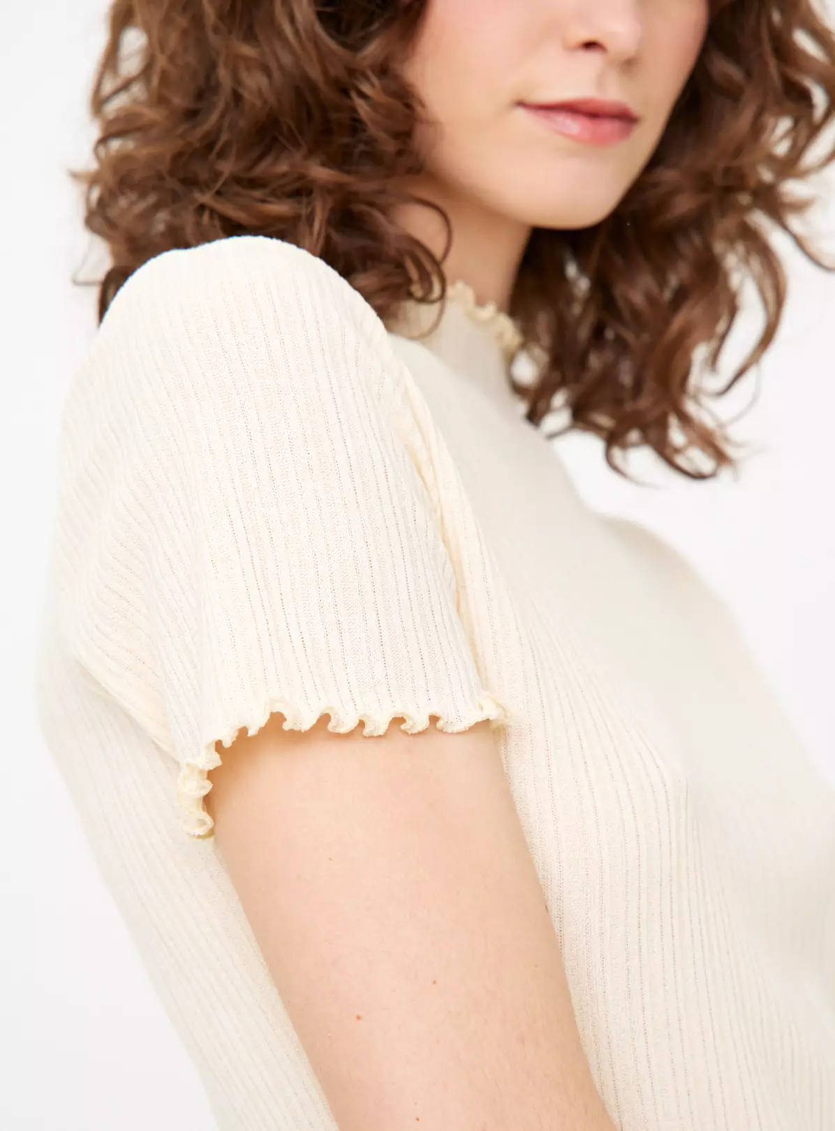 Elevated by a flattering lettuce hem, our cream top comes in a comfy ribbed fabric, perfect for all-day wear. For a current look, team it with our wide leg denim jeans and a pair of nude pumps.