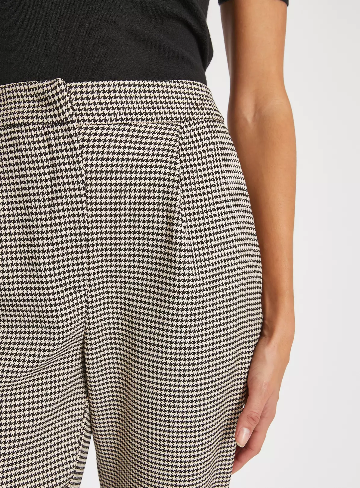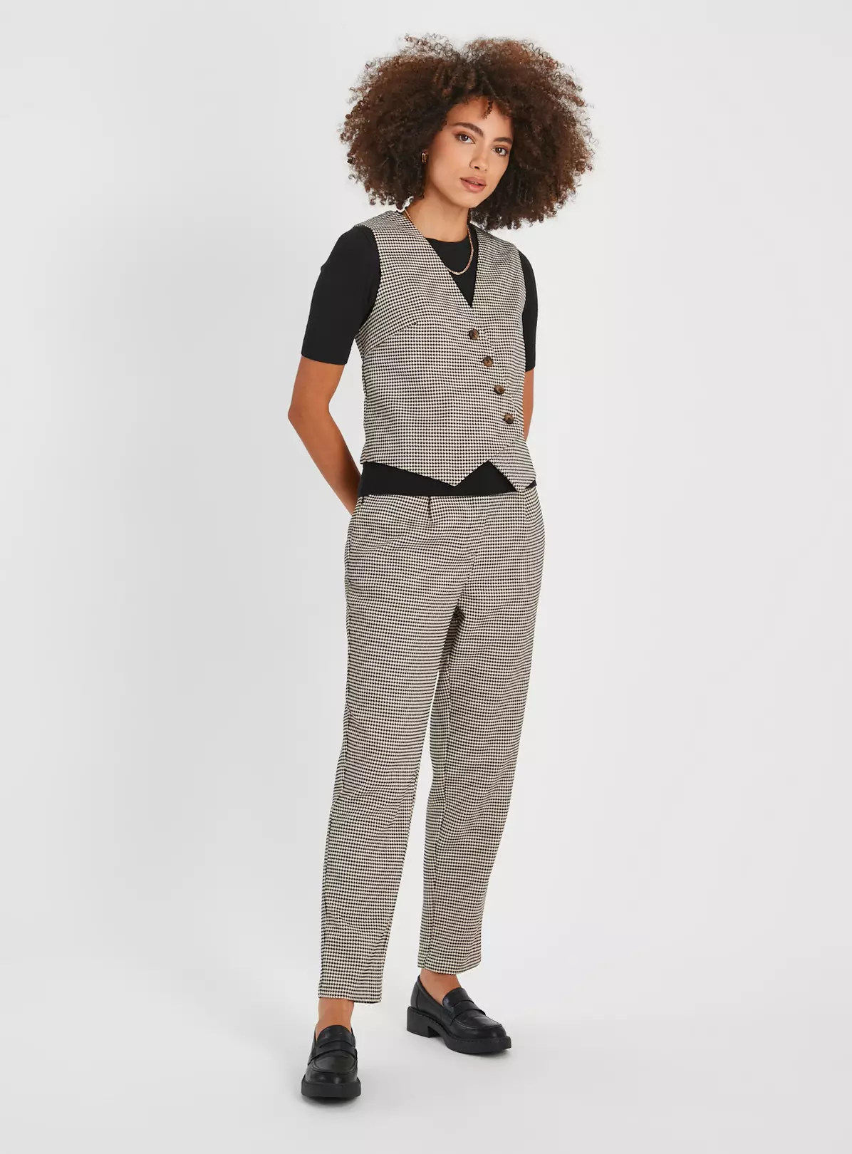 Jump on the tailoring trend with our dogtooth print trousers. In a flattering tapered leg design with two front pockets. Style with the matching waistcoat and a cute pair of loafers.