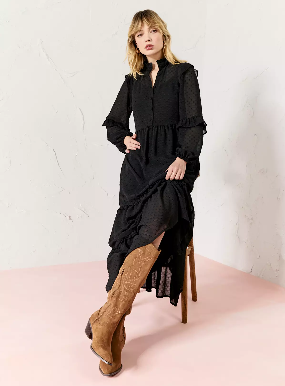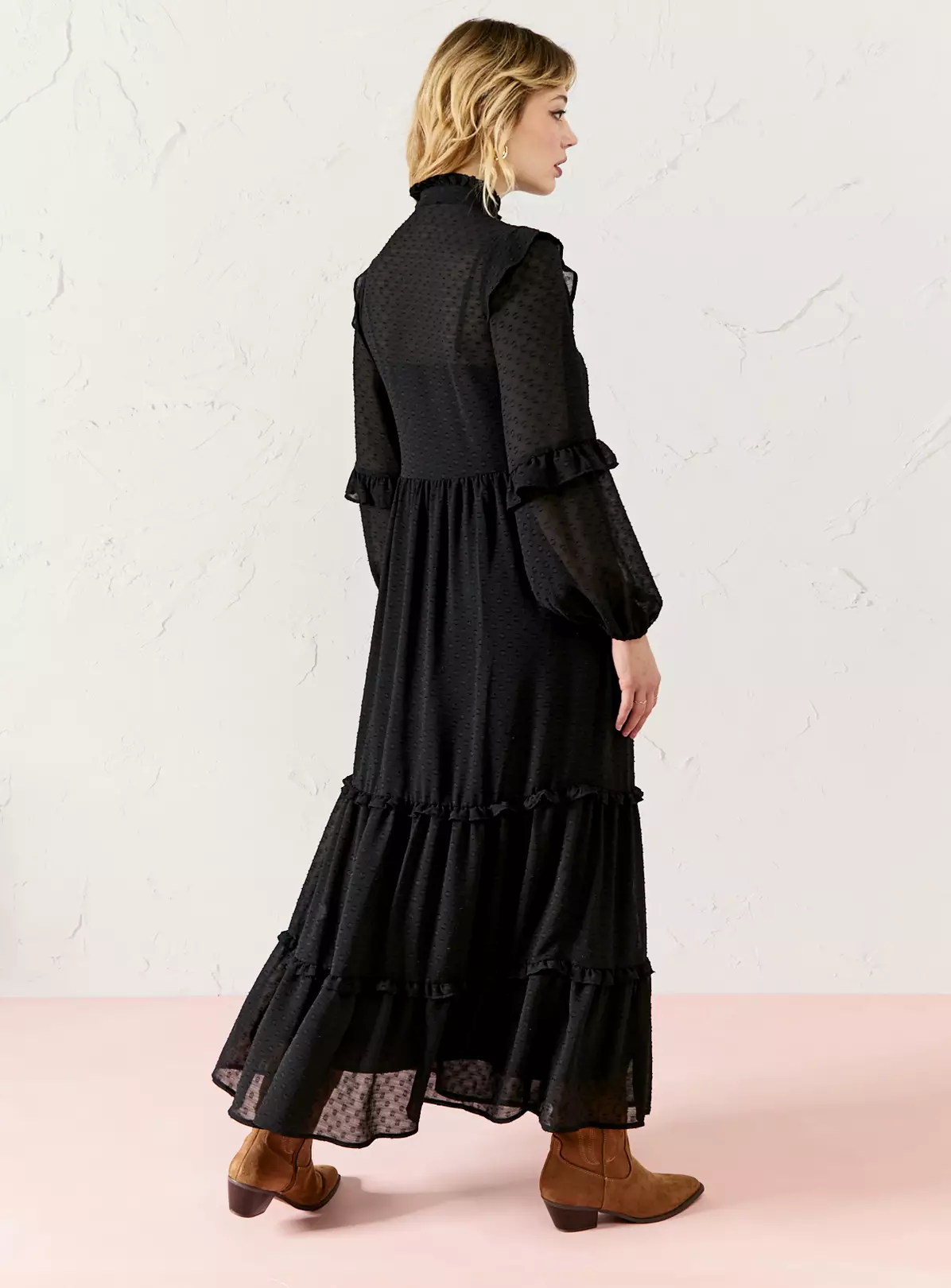 EVERBELLE Black Dobby Print Ruffle Tiered Maxi Dress 12