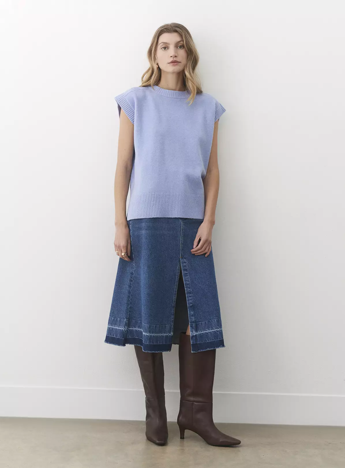 Our knitted Ava Vest is the perfect wardrobe addition to layer over your favourite shirt or midi dress this season. With ribbed detail along the neck and hemline, a slightly boxy finish for an oversized fit.