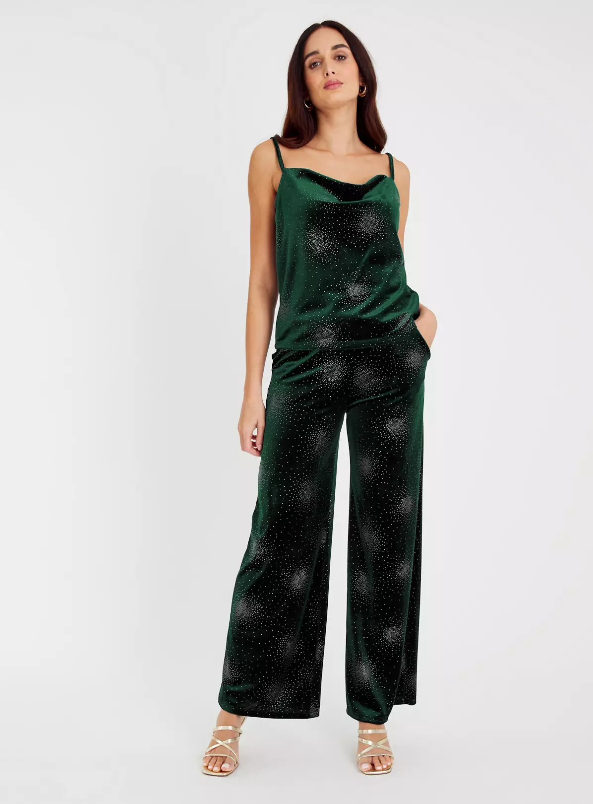 A staple top for your parties and festive celebrations! Our show-stopping cami top features a flattering cowl neck and has an all-over sparkle embellished design for an extra glam look. Team it with faux leather trousers and your favourite heels.