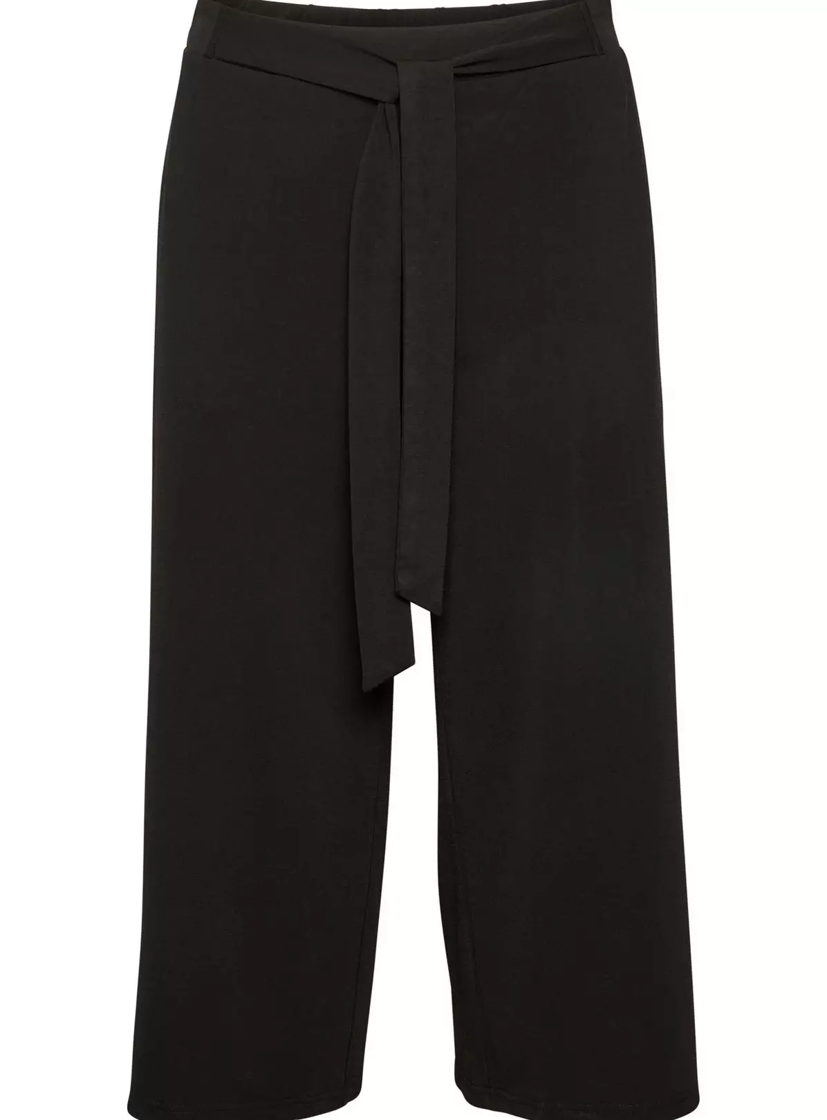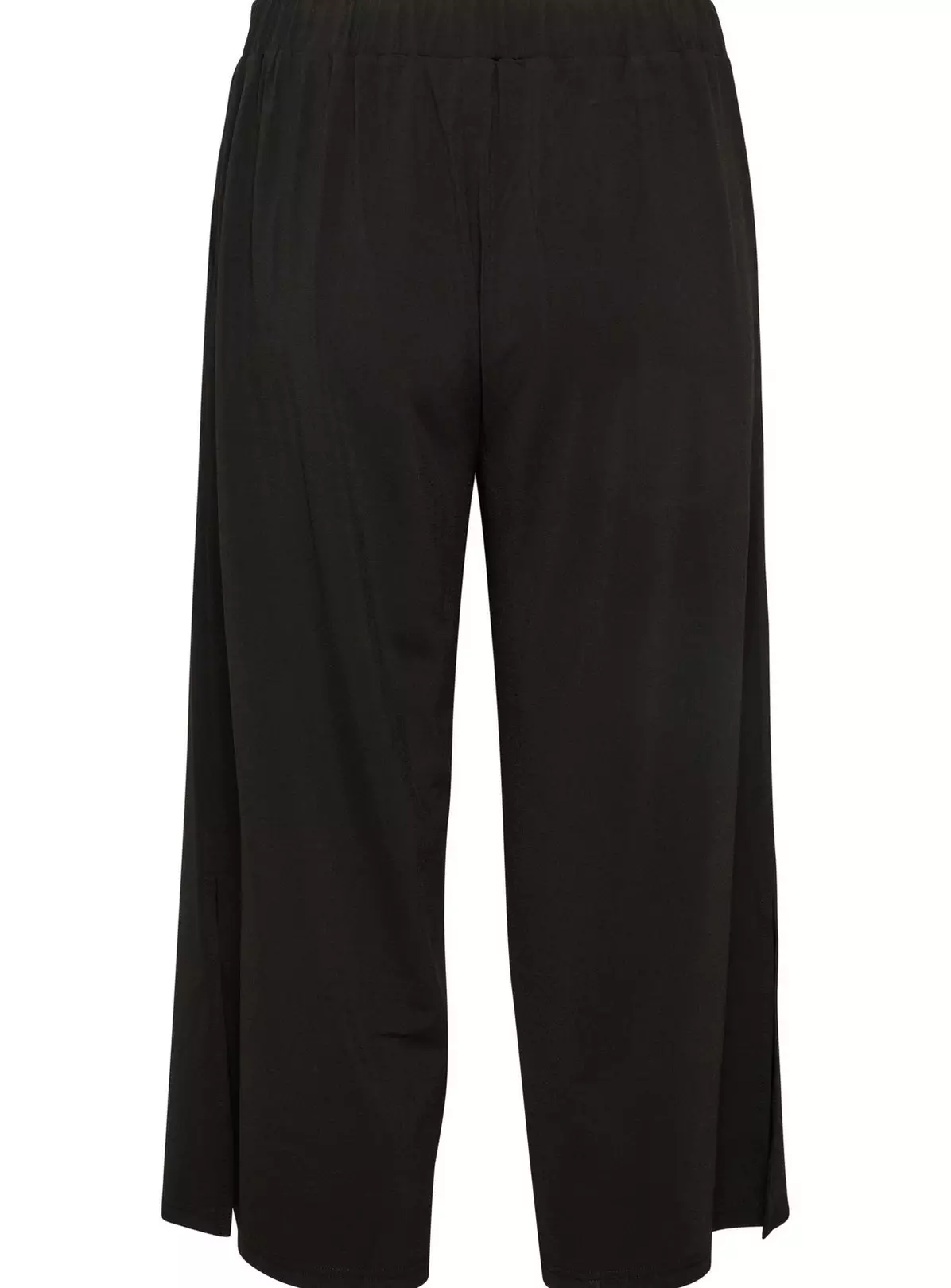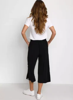 These trousers feature an elasticated waist with a tie, a relaxed fit, cropped length, side slits and straight legs with culottes design.