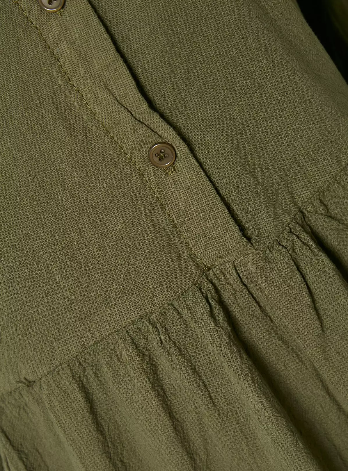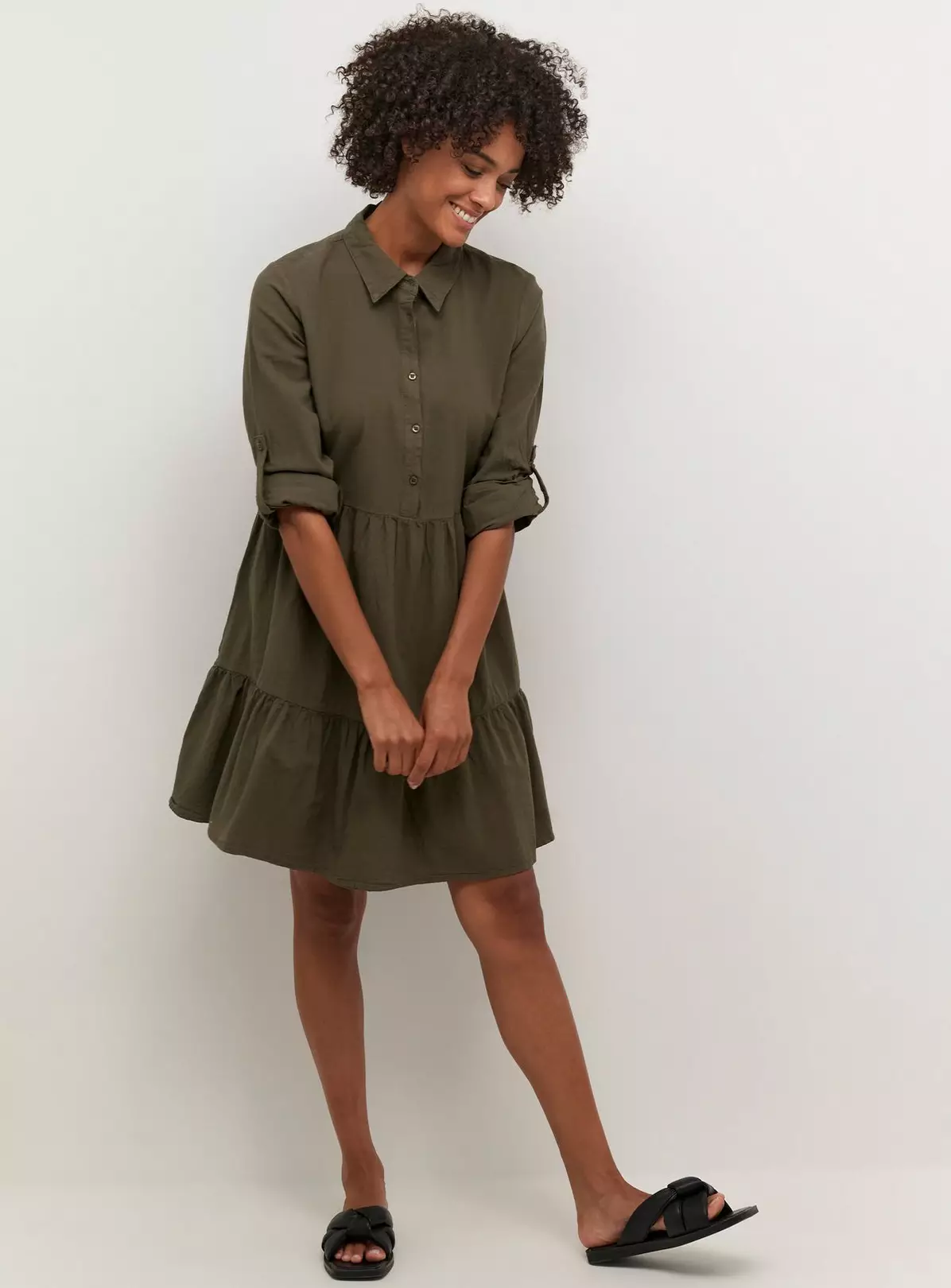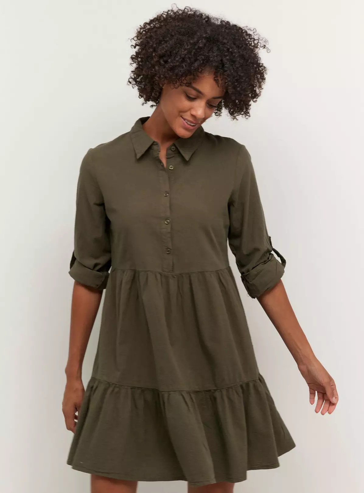 Chic, casual dress with a short length, long sleeves, collar, half-value front, flared ruffled skirt, and feminine silhouette.