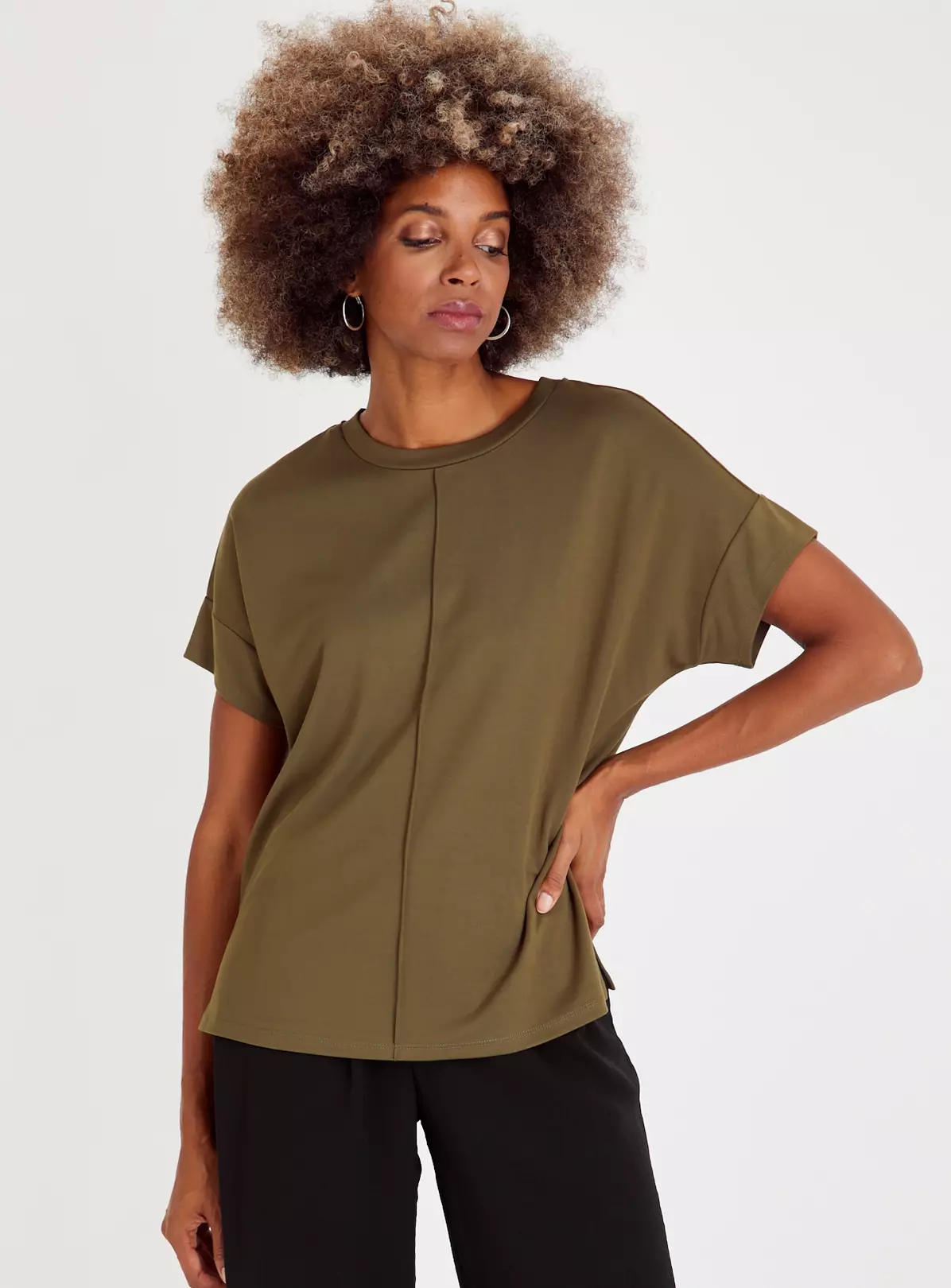 Current, cosy and khaki, this ponte top is one of our favourites! It comes in a flattering relaxed fit and features a stylish seam detail. Team it with dark wash denim jeans for a laidback look.