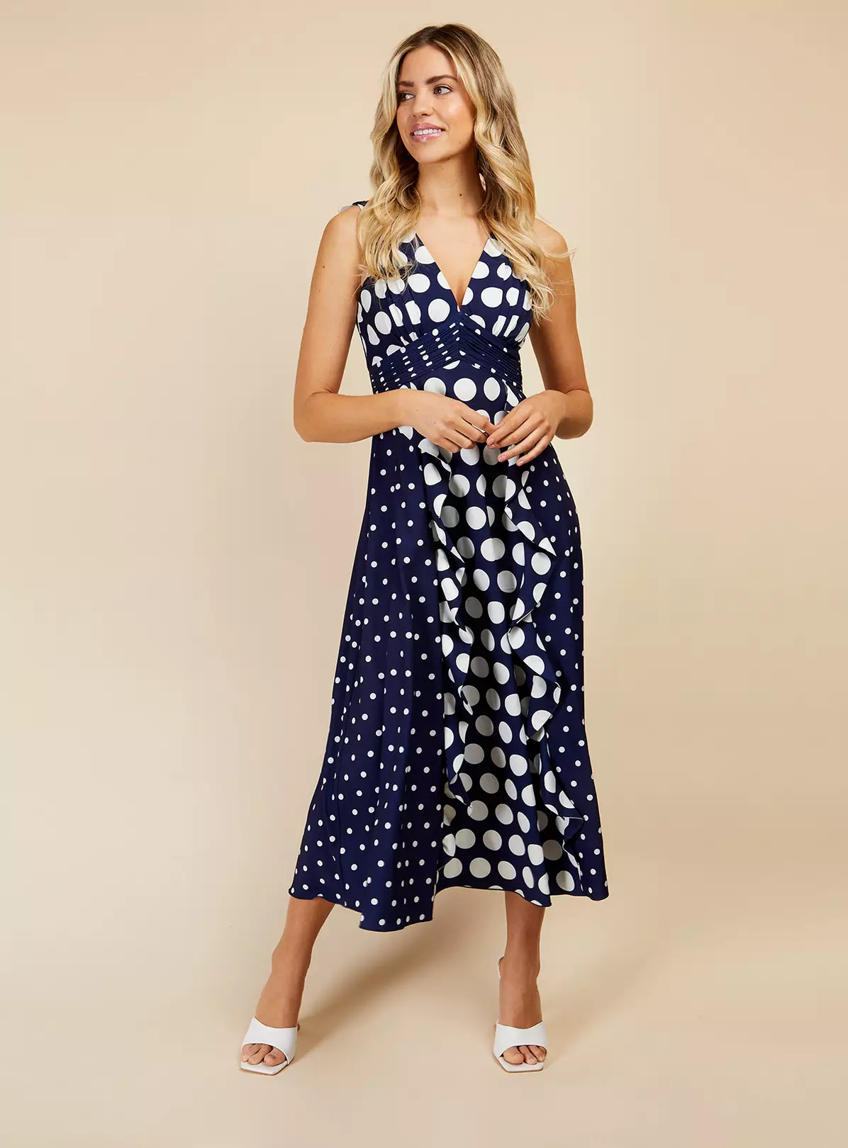 Playful polka dots and fluttery ruffles make this midi a dream to wear. Bra-friendly and bust-flattering, you’ll love how the under-bust ruching cinches your middle and the shirred back makes it super comfy. Add heels and a clutch to make it wedding, races or special occasion ready.