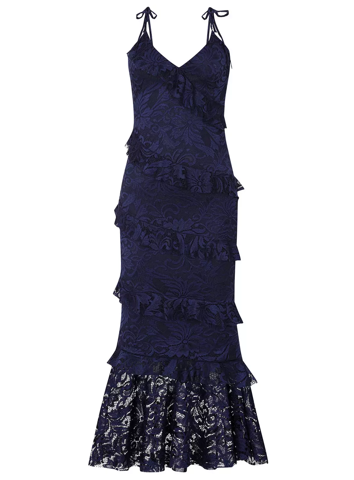 Crafted from delicate lace and decorated with feminine ruffles, this midi makes the perfect elegant occasion option. Topped with tie detail cami straps and featuring a sexy v-neckline, it’s cut to drape softly over your curves and finished with a sheer hem. we love it with metallic heels.