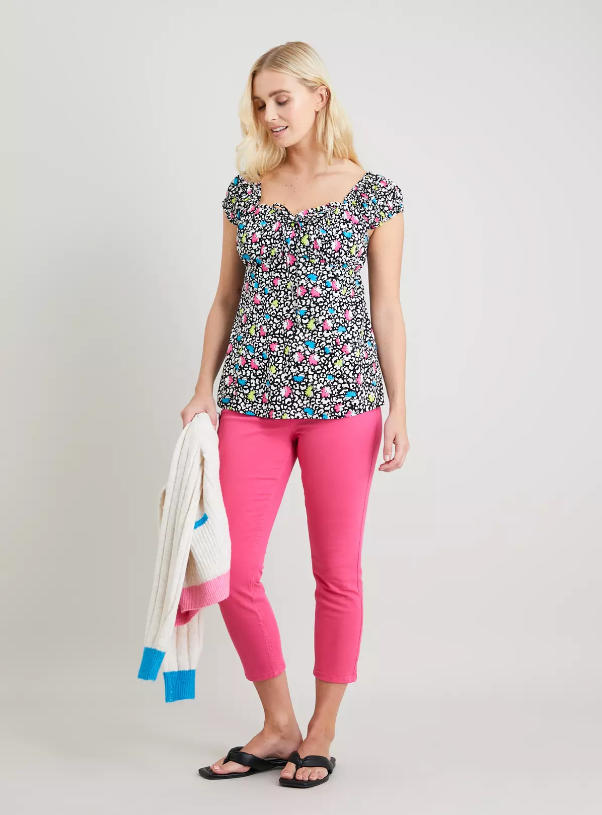 Our gorgeous mono animal print top has an elasticated sweetheart neckline with bow, elasticated cap sleeves and is perfect for adding a boho look to your spring/summer wardrobe. Team with bright pedal pushers and sandals for a cute warm weather look.