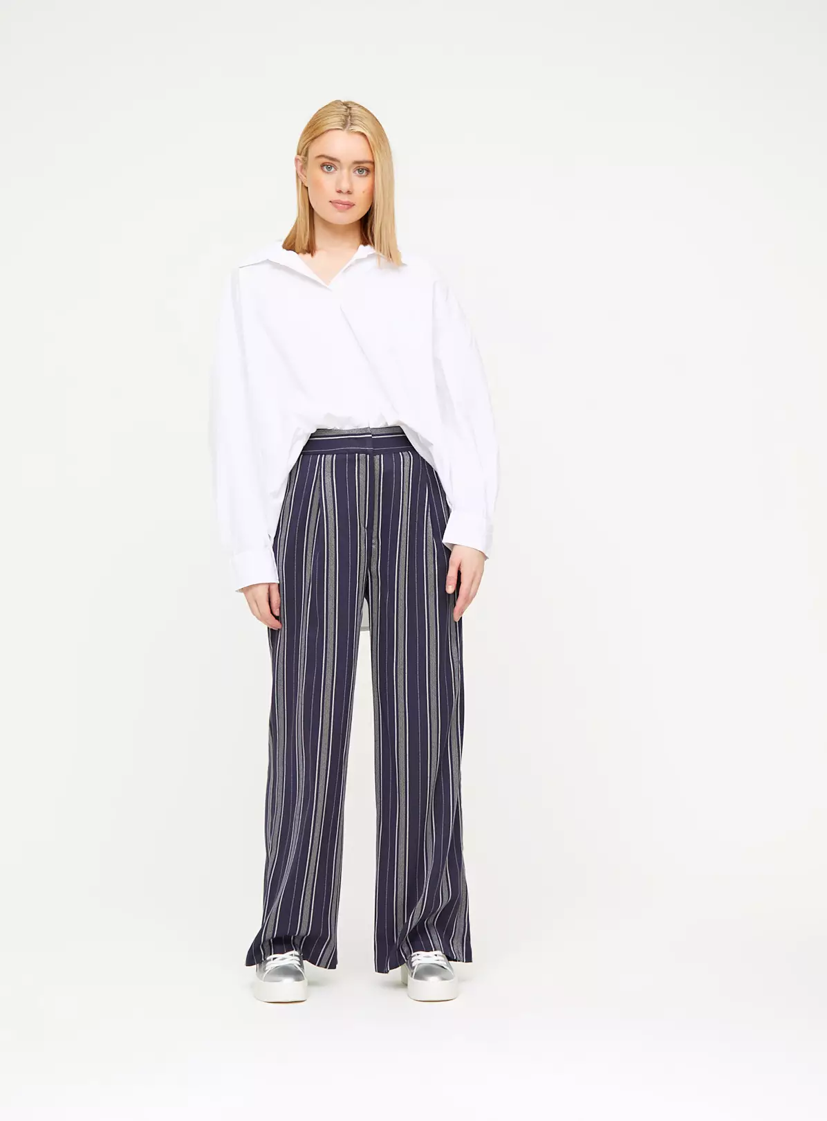 Our navy blue stripe trousers are elevated by a wide leg fit and a flattering vertical stripe pattern throughout. They are a must-have for your workwear wardrobe. Add a plain white shirt and statement trainers for instant office style.