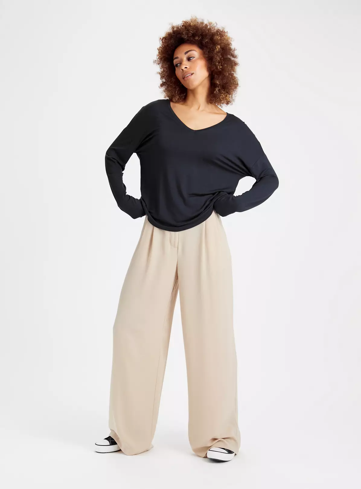 Build up your basics with our navy long sleeve top. Featuring a flattering v-neckline, it’s the perfect piece for layering during the colder months. Style with a padded gilet and denim jeans for a casual look.