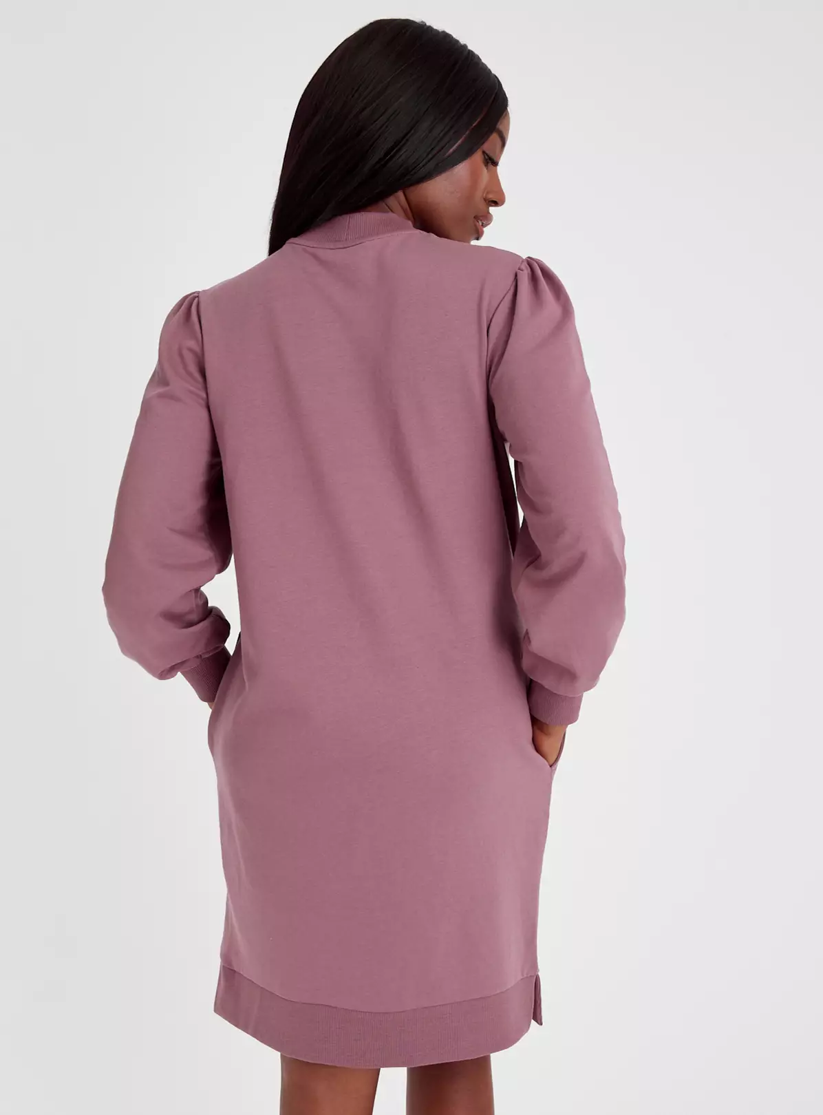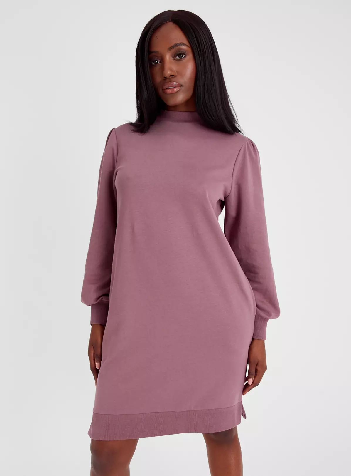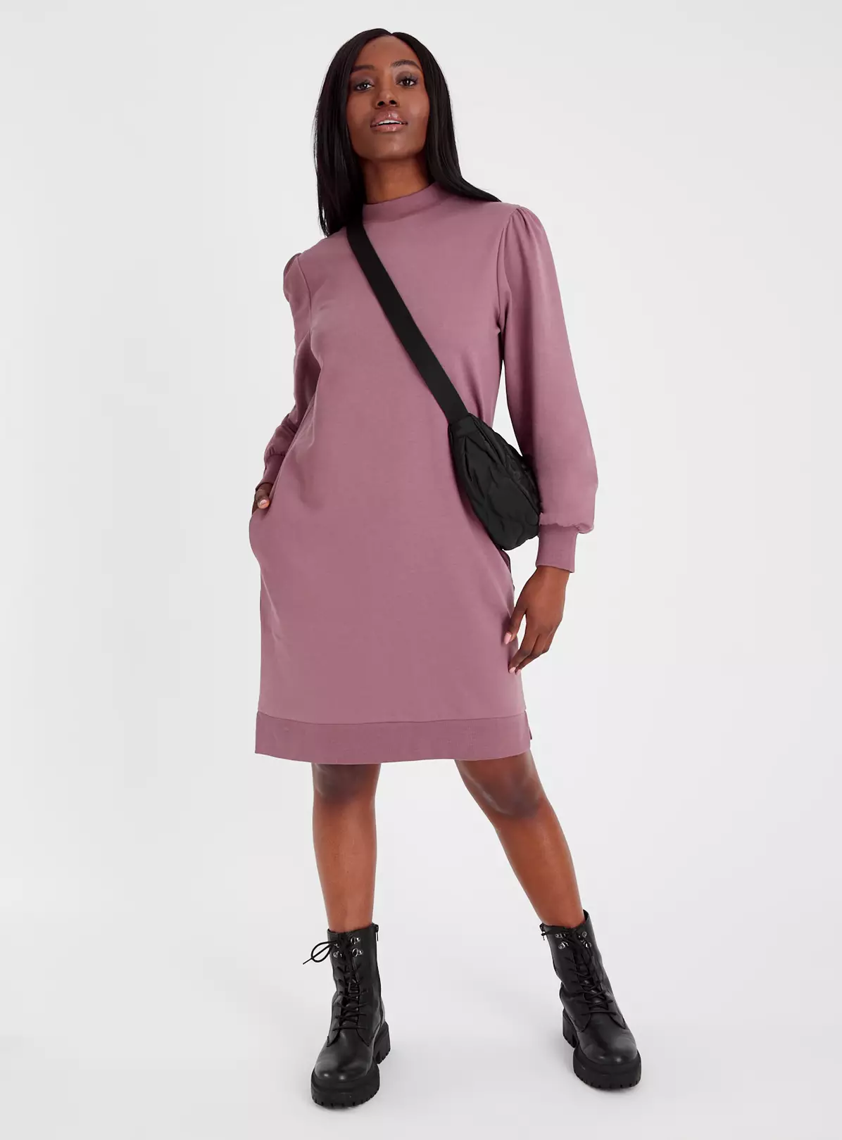 A jumper dress is a must-have for your winter wardrobe! In a sweater style this dress features a flattering high neck and subtle blouson sleeves. In a shade of dusky pink, it’s a pretty piece that you can pair with long boots.