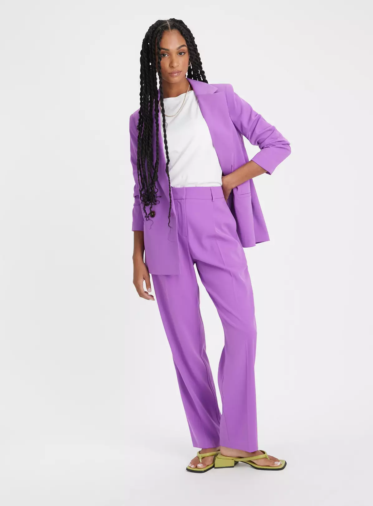 Add a pop of colour to your wardrobe with our gorgeous purple trousers. In a flattering straight leg, with handy pockets and belt loops to add your own belt. Pair with the coordinating blazer to complete the look.