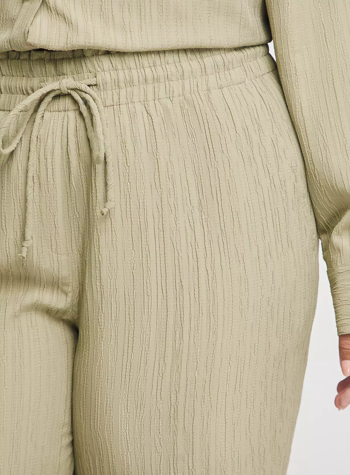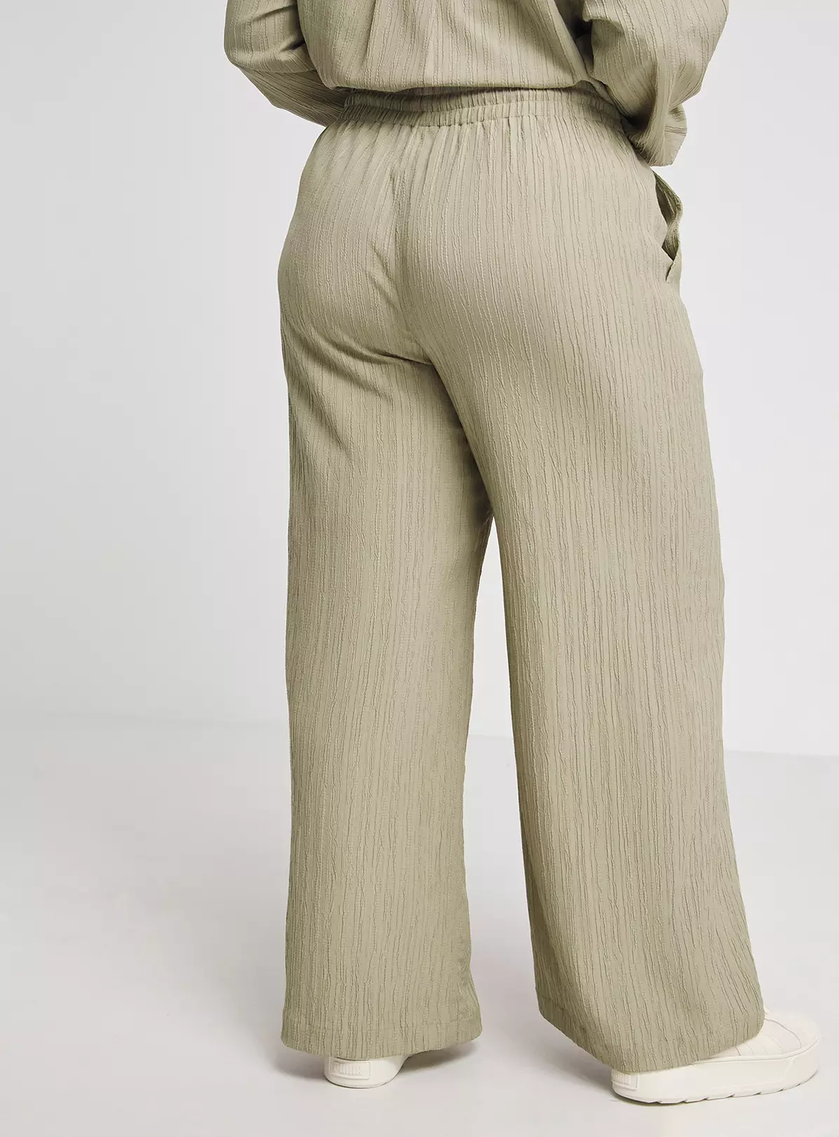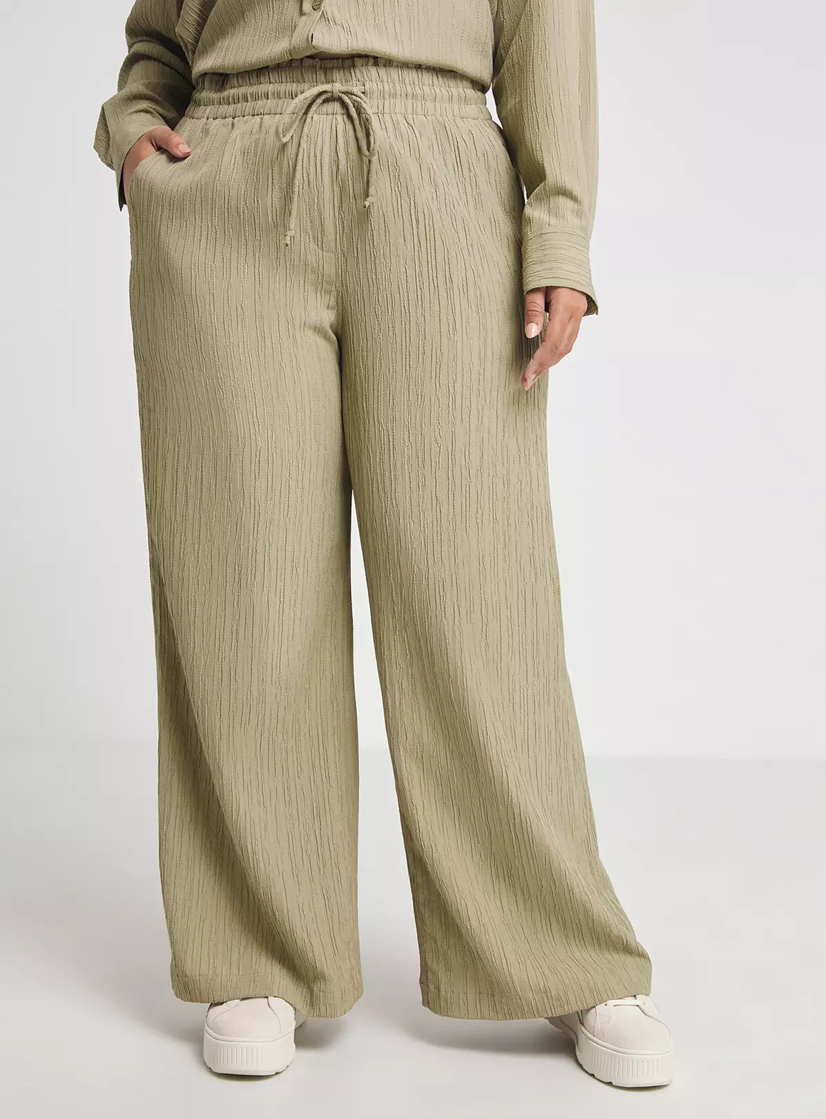 Our gorgeous Textured Wide Leg Trousers are perfect for your new season wardrobe. Featuring a drawcord high waist and stunning textured material. Shop these trousers in Black or Sage. Style with a white bodysuit and chunky sandals to complete your look.