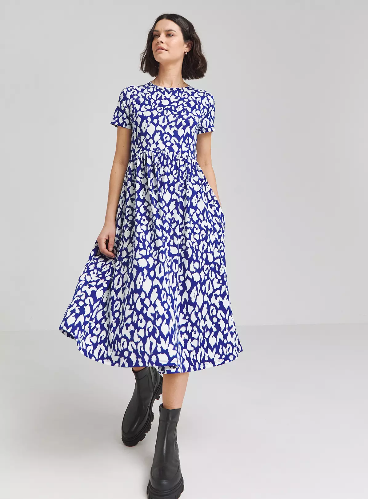 Our best selling supersoft smock dress is back! This season it is in a blue animal print, with the same practical pockets and gorgeous material. Pair with some comfy trainers.