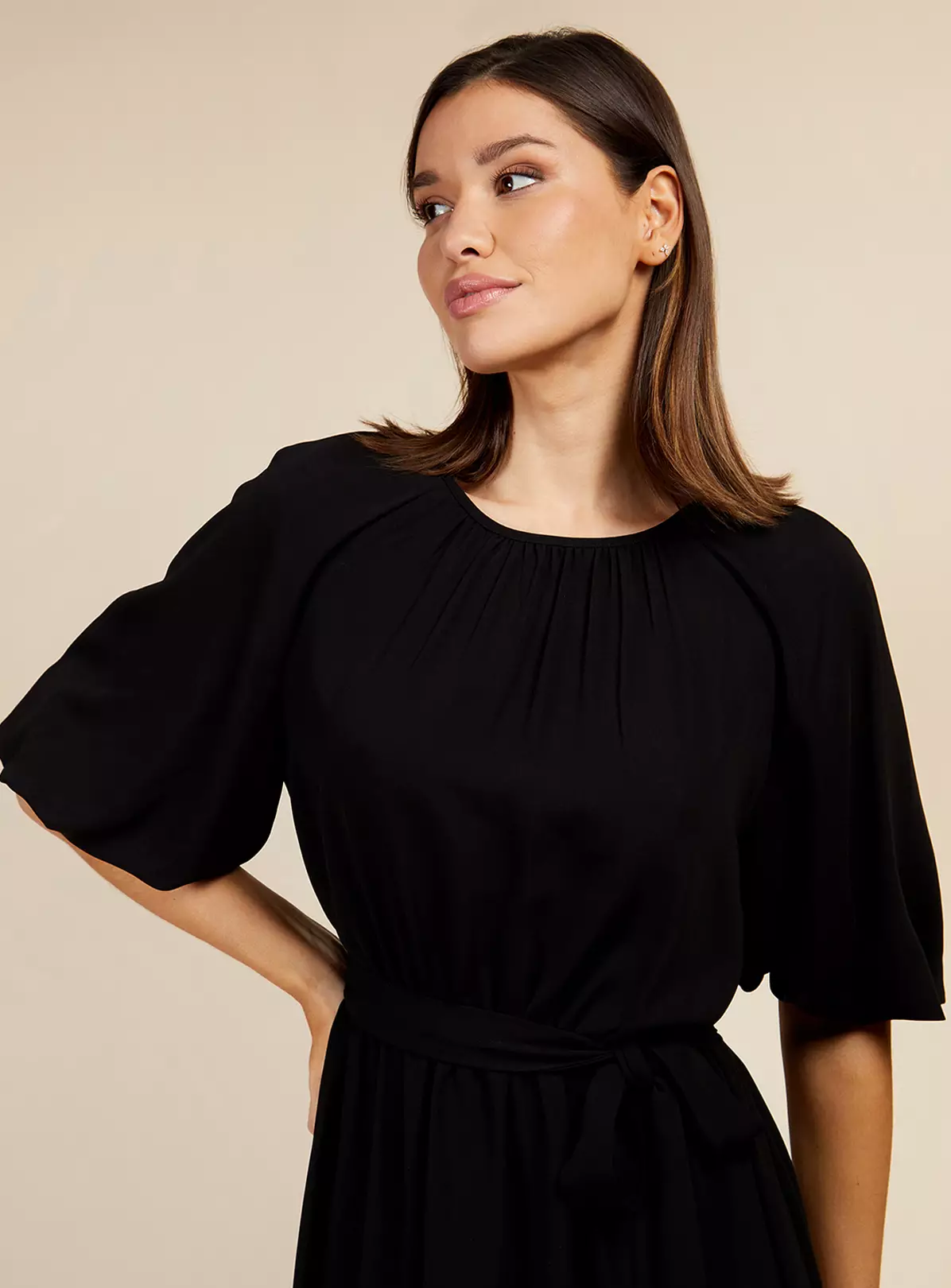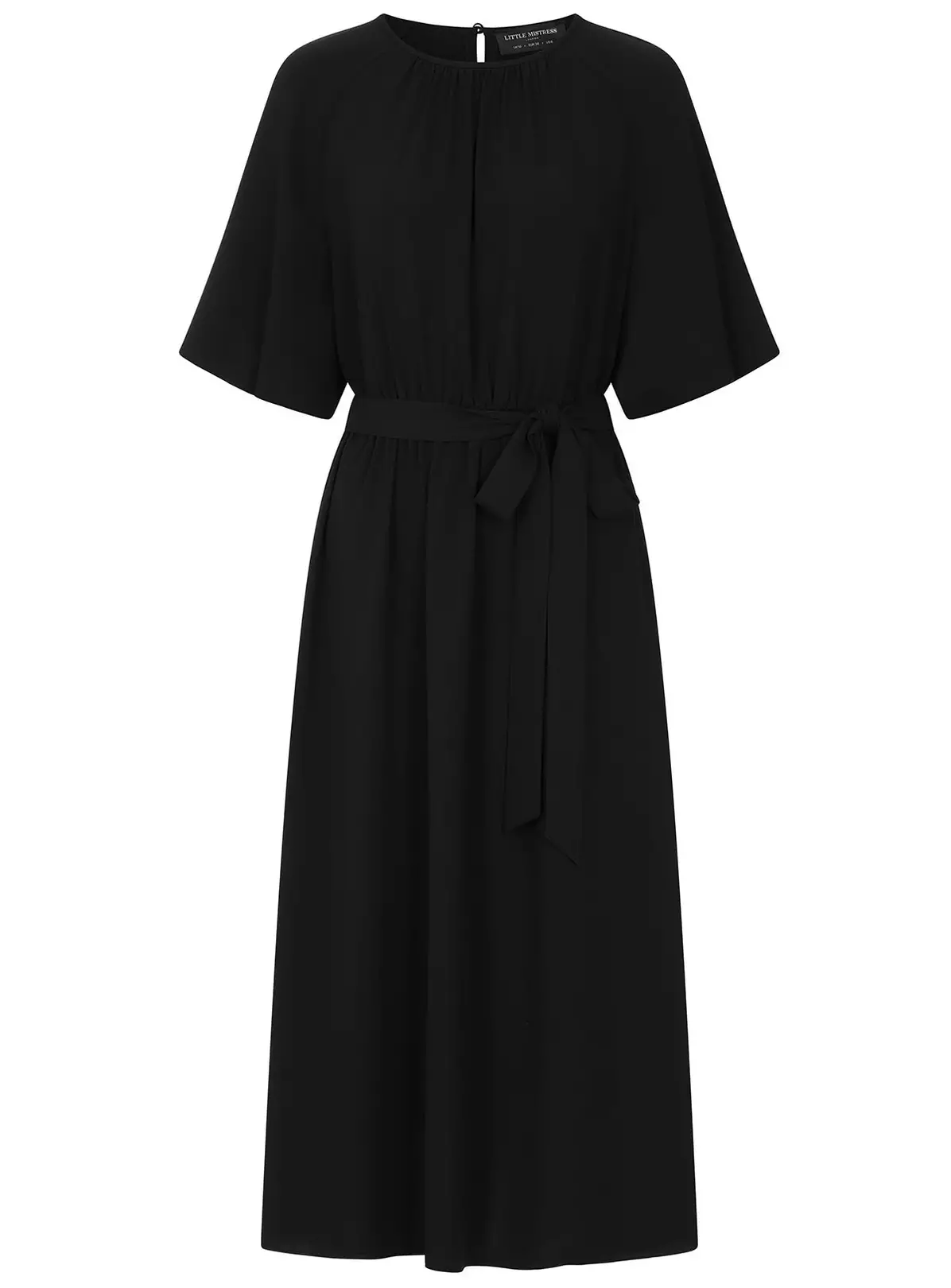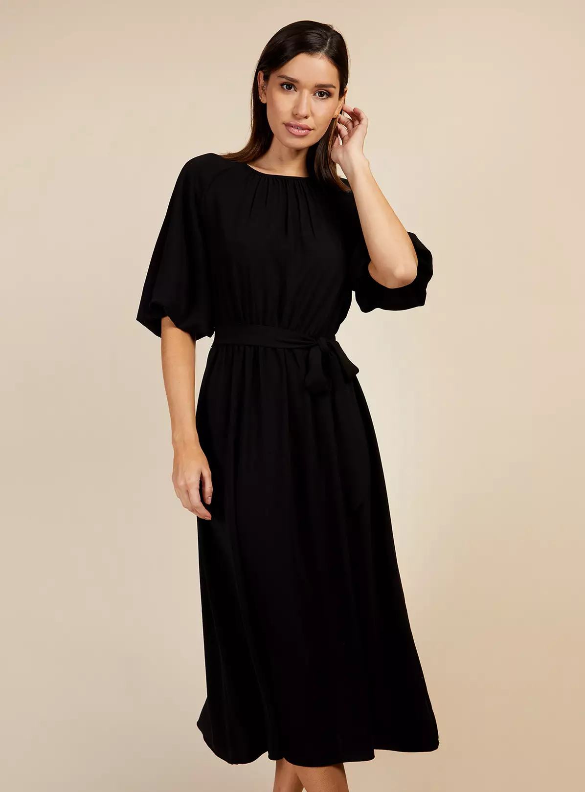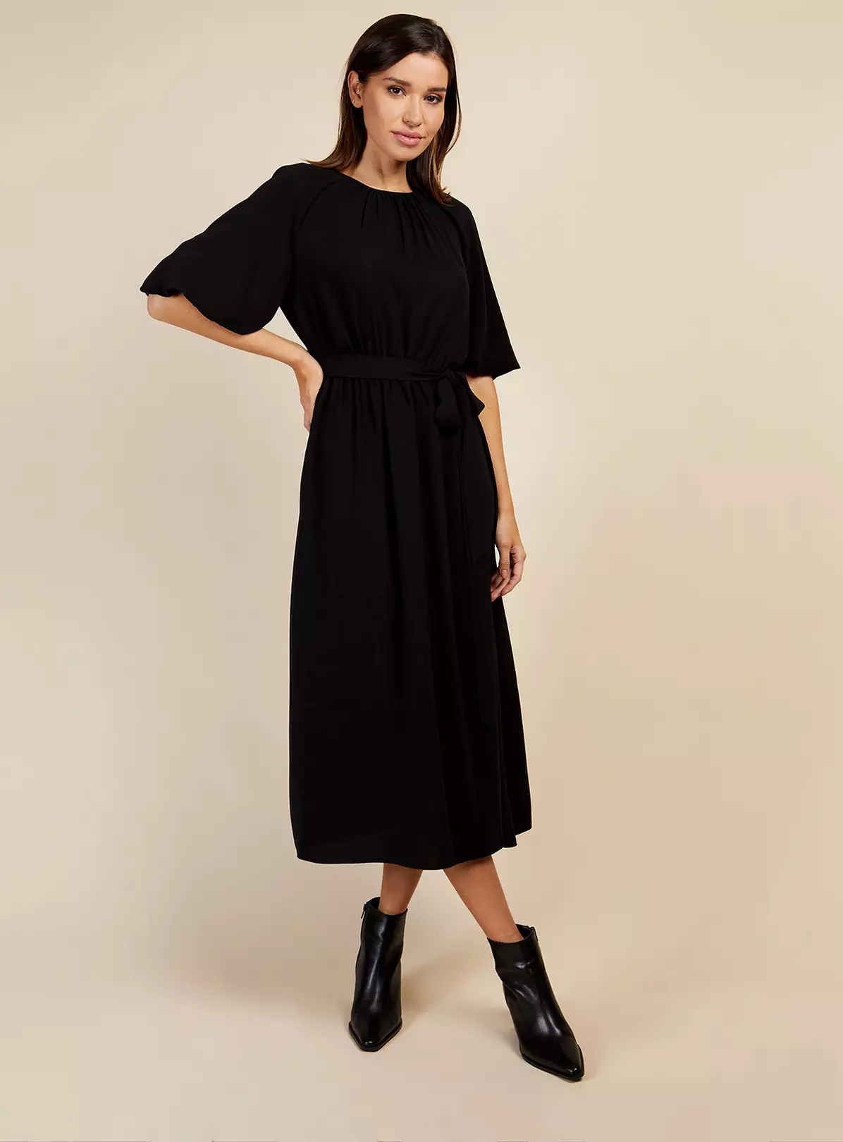 Woven midi dress in black with elasticated waistline. Complete with round neck, short balloon sleeves and flared hemline. Featuring a fabric self-tie belt.