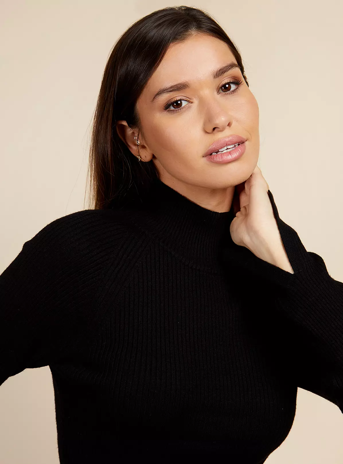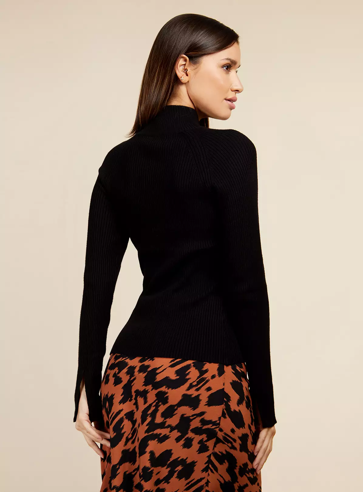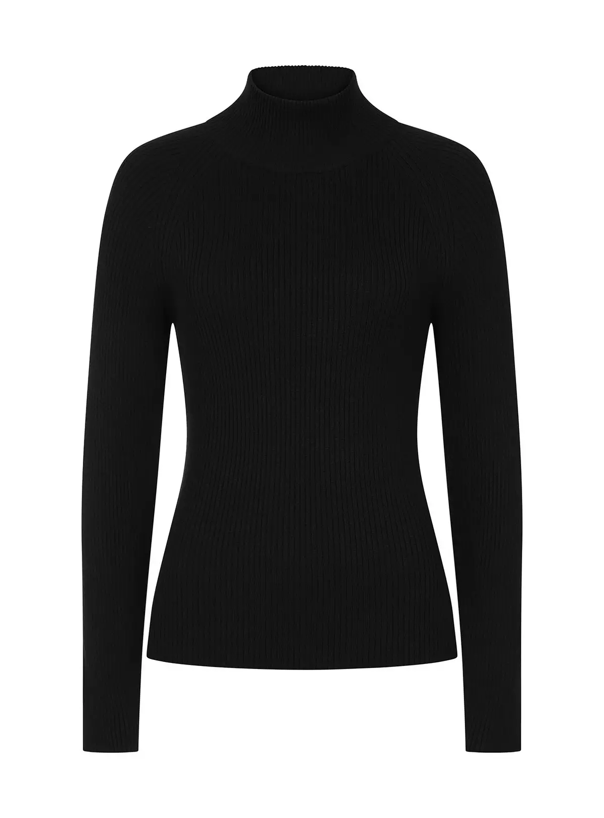 Fitted black ribbed knit jumper with high neck and long sleeves. The perfect transitional wardroble staple, basics have never looked so good.