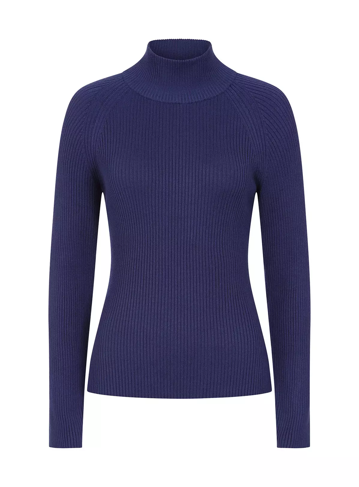Fitted navy ribbed knit jumper with high neck and long sleeves. The perfect transitional wardroble staple, basics have never looked so good.