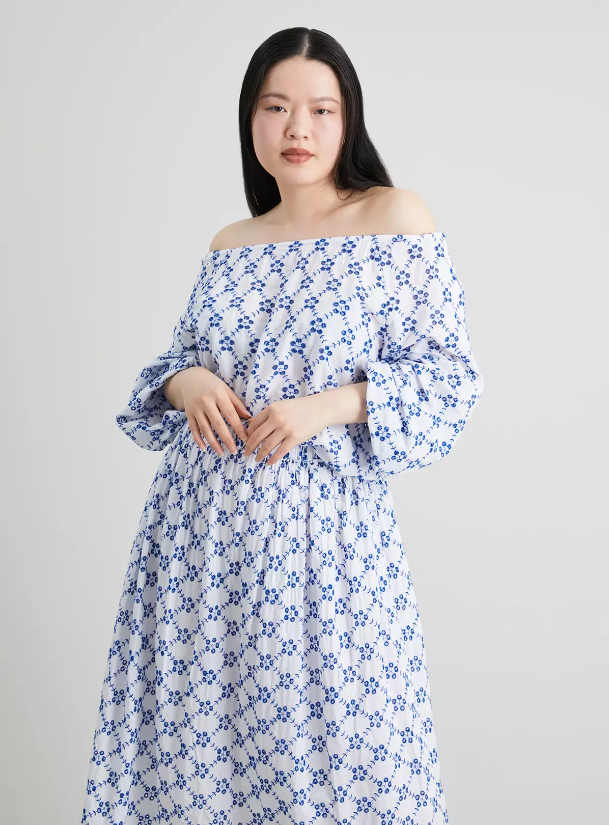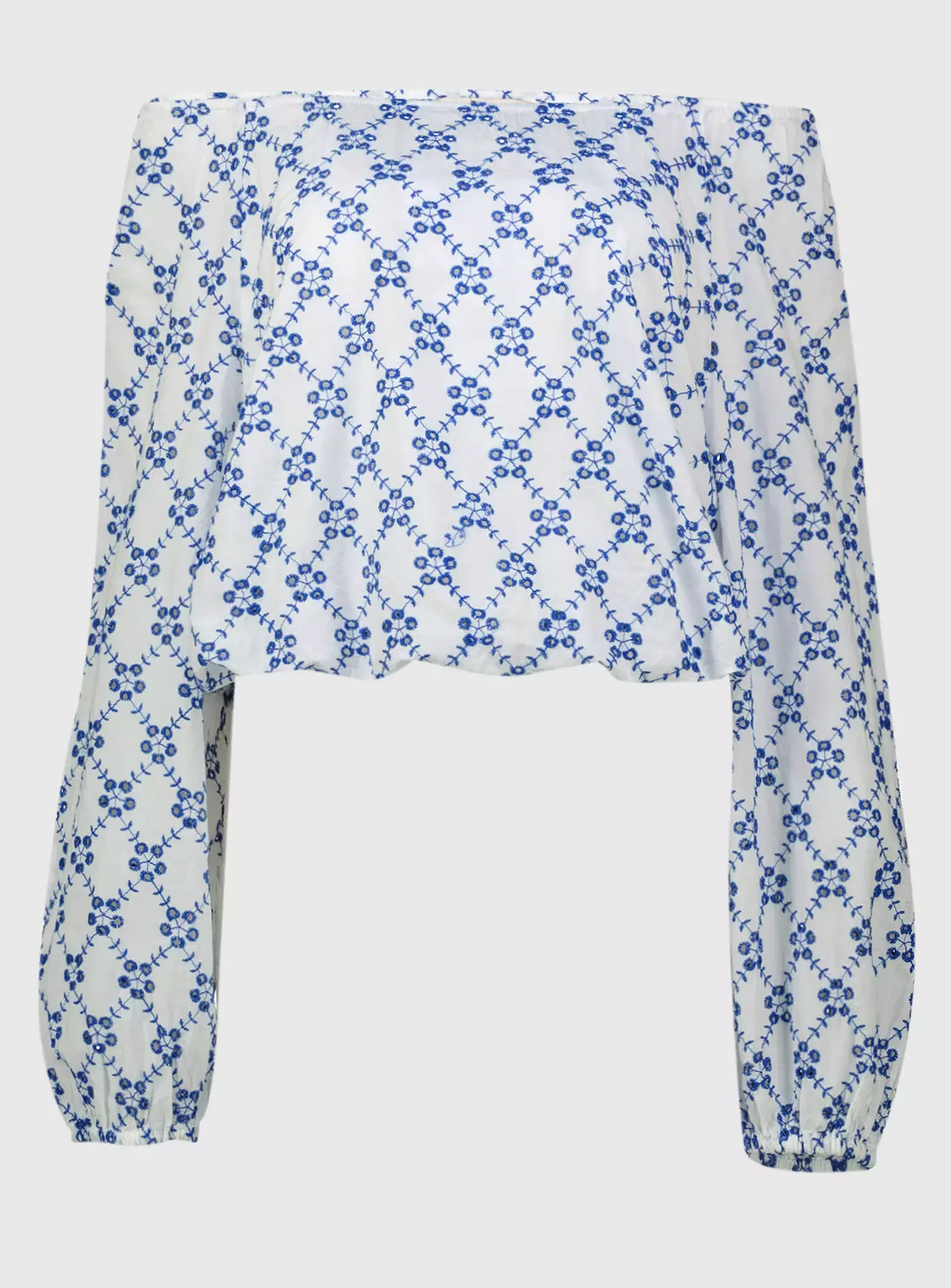 Create a demure summer sensation with this blue and white broderie top. With long, puff sleeves and a sassy bubble hem, it’s perfect for adding new life to your blue jeans. Or if you want to go all out, grab the coordinating skirt and waft around in a summer haze! (style no: 140778754).
