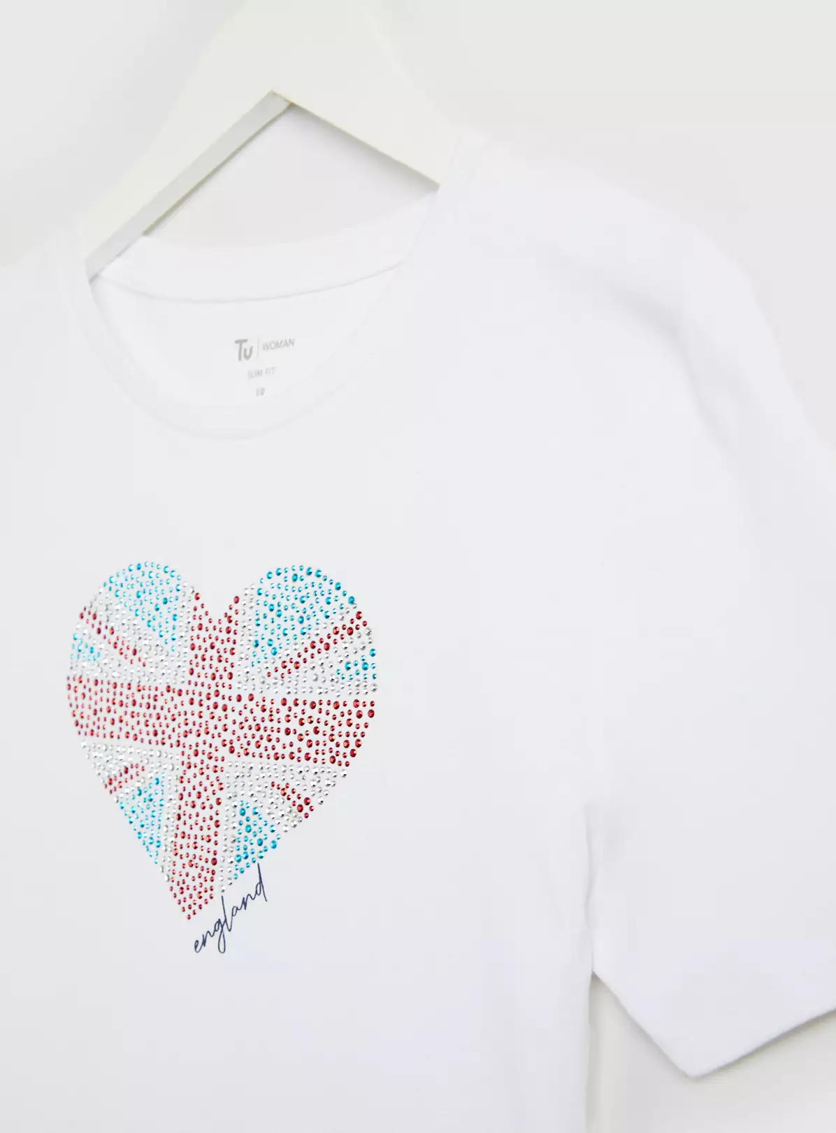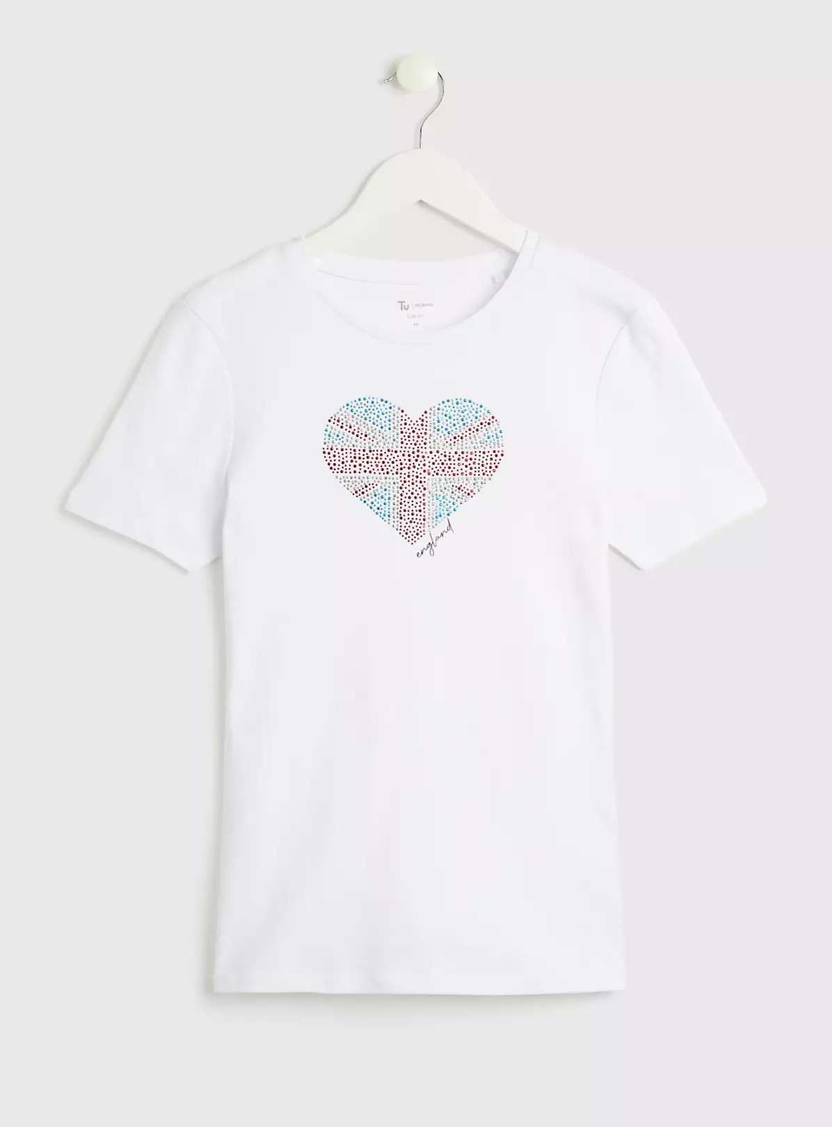 Football fan? Support in style in our world cup tee! In classic white with a Union Jack diamante heart with ‘England’ written in on the front. It comes with a crew neck and short sleeves, we think it looks great with a denim skirt and jacket, finished with some casual trainers.